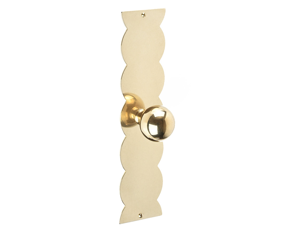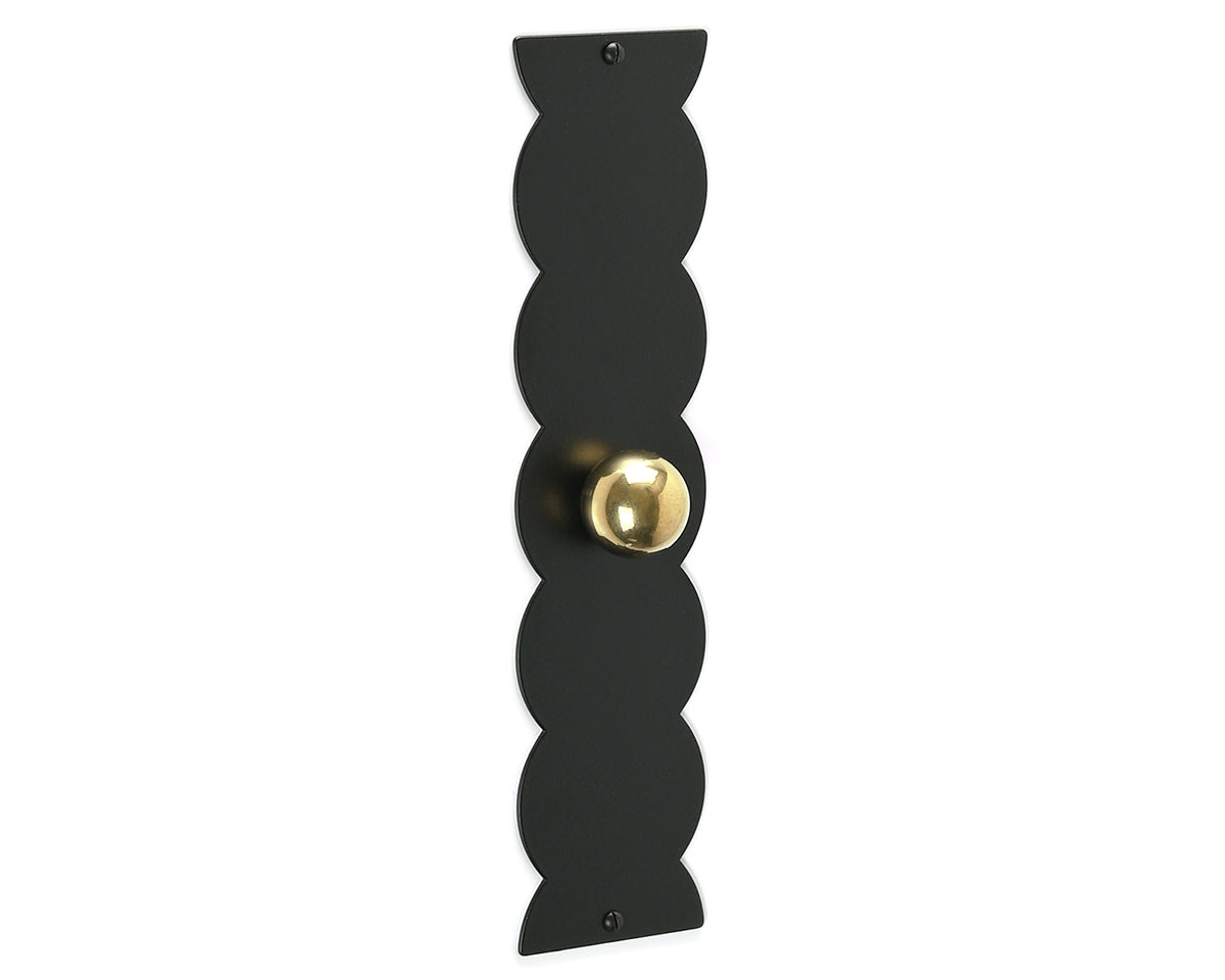 The scalloped Feston P backplate by Bonnemazou Cambus is inspired by architectural ornamentation and sewing patterns. We offer it with a choice of three knobs: The orb-shaped Bille Small (non-footed) and Bille Medium (footed), or the stepped Degre Medium. The plate and knob are each offered in either polished, waxed natural brass — which has an aged, shiny but not mirror-like appearance — or sandblasted stainless steel with a satin-black powder-coated finish, and screws to match. The natural brass finish is meant to look worn-in, and may arrive with small pits, scratches, or other imperfections, and will patina over time unless it’s polished back to its original state.