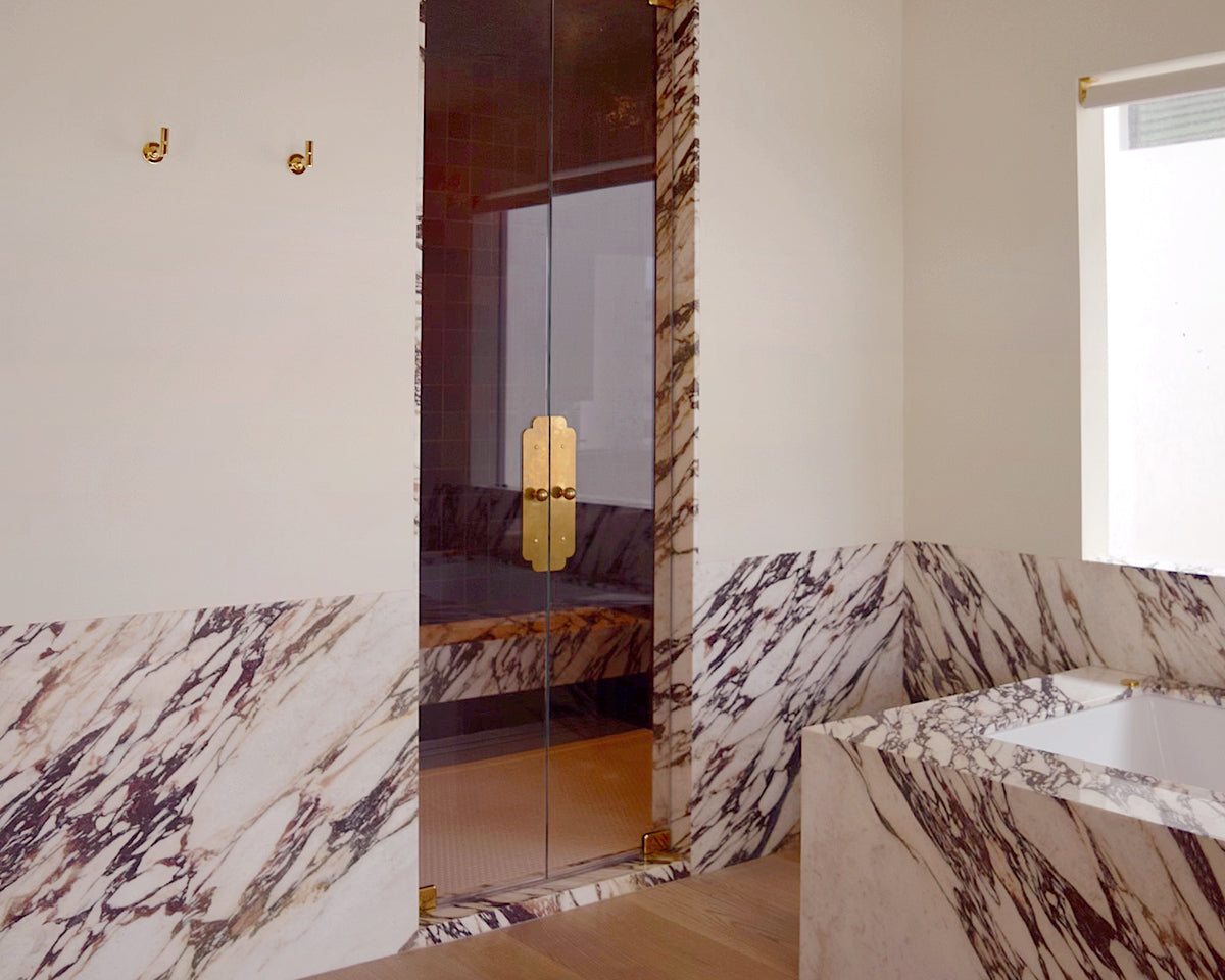 These handles can also be installed back-to-back on glass shower doors with an optional customization — as shown in photos in an interior by Meredith Stern. If selected in checkout, you will receive a pair of large backplates, a pair of knobs of your choosing (medium only), two large Chicago screws to mount the plates to the glass (rather than four small screws), and a double-ended mount for the handles, plus plastic spacers for all screws. The set is designed for glass that's 9.5 mm thick — if you're using glass that's thicker and need longer Chicago screws, please email us after ordering.