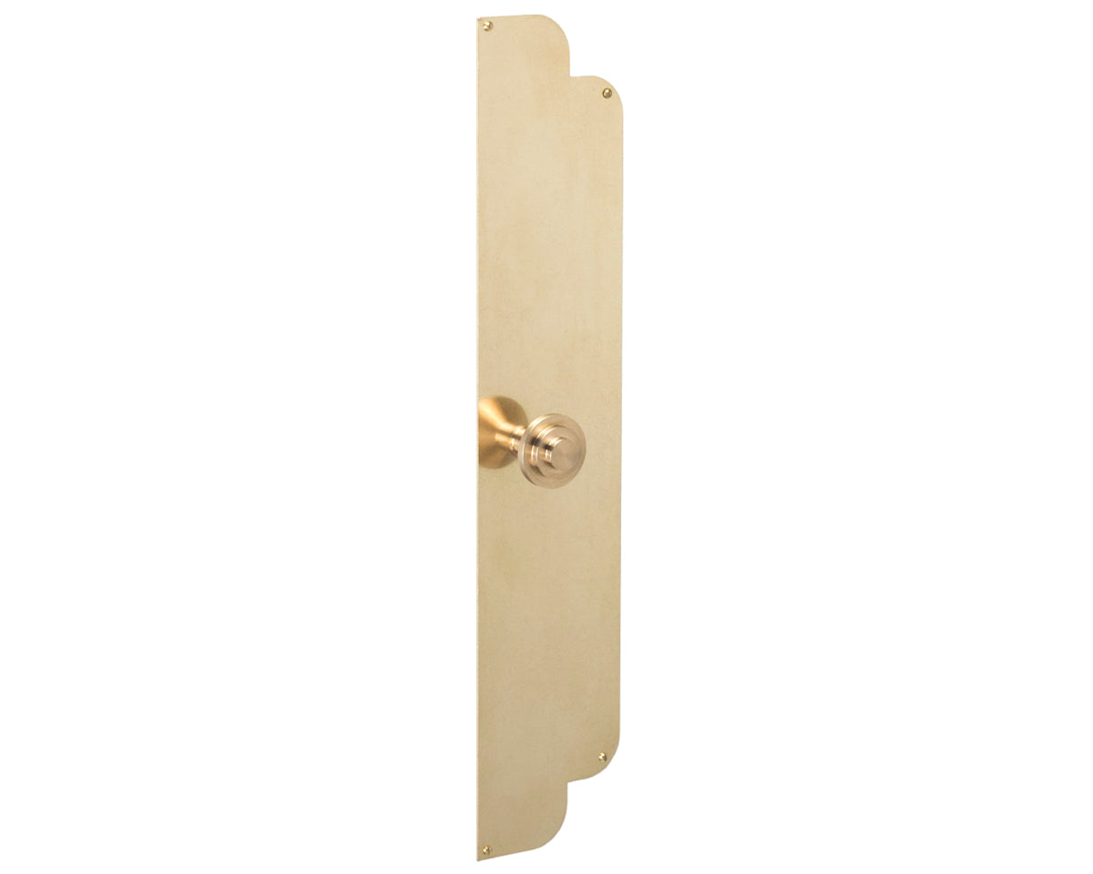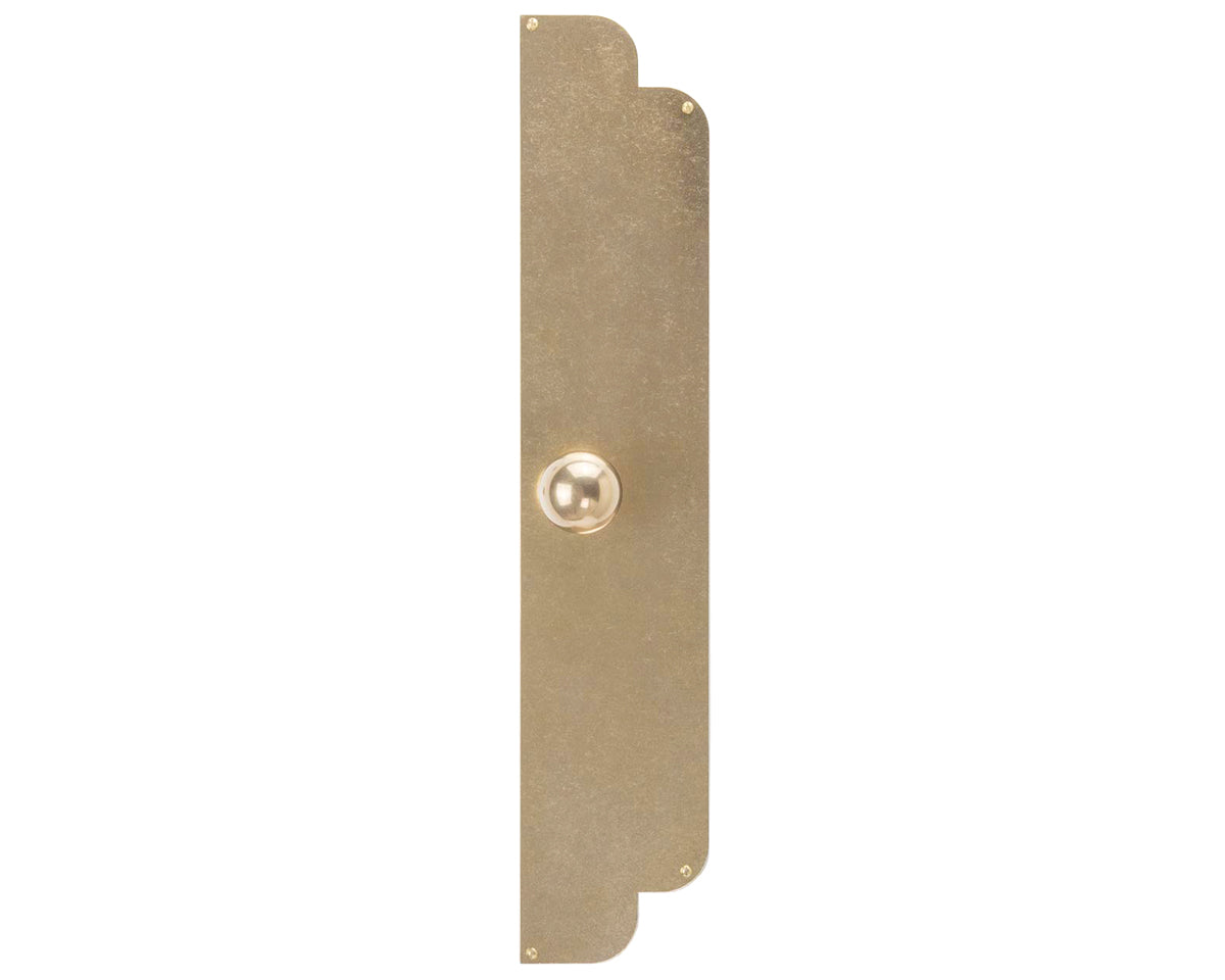 The cloud-inspired Nuage backplate by Bonnemazou Cambus is a contemporary take on a classical shape. We offer it with a choice of three knobs: The orb-shaped Bille Small (non-footed) and Bille Medium (footed), or the stepped Degree Medium. The plate and knob are offered in waxed natural brass, which has an aged, shiny but not mirror-like appearance, with screws to match. The finish is meant to look worn-in, and may arrive with small pits, scratches, or other imperfections, and will patina over time unless it’s polished back to its original state.