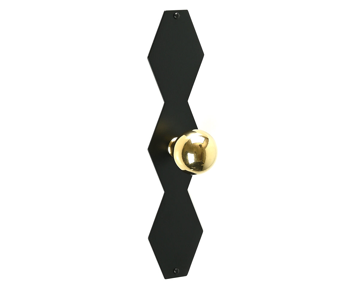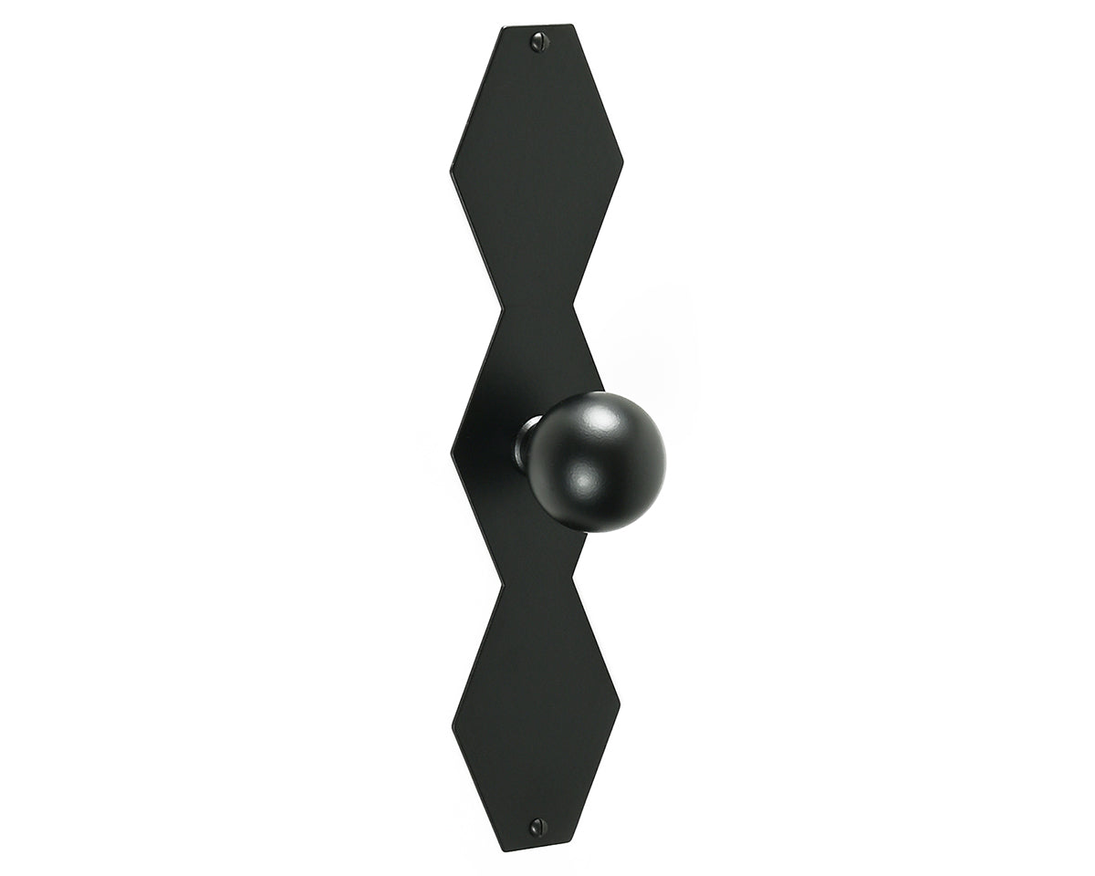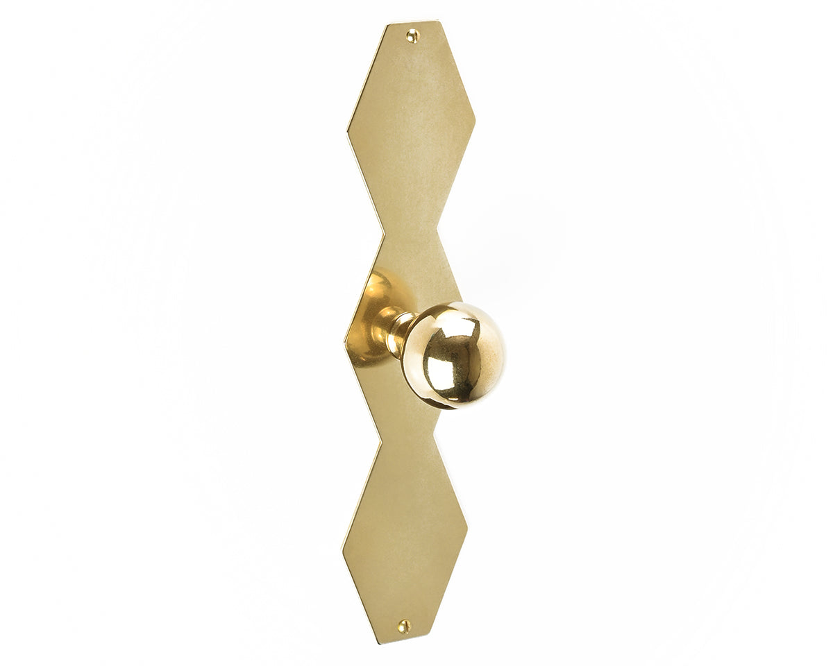The zig-zagged Feston Z backplate by Bonnemazou Cambus is inspired by architectural ornamentation and sewing patterns. We offer it with a choice of three knobs: The orb-shaped Bille Small (non-footed) and Bille Medium (footed), or the stepped Degre Medium. The plate and knob are each offered in either polished, waxed natural brass — which has an aged, shiny but not mirror-like appearance — or sandblasted stainless steel with a satin-black powder-coated finish, and screws to match. The natural brass finish is meant to look worn-in, and may arrive with small pits, scratches, or other imperfections, and will patina over time unless it’s polished back to its original state.