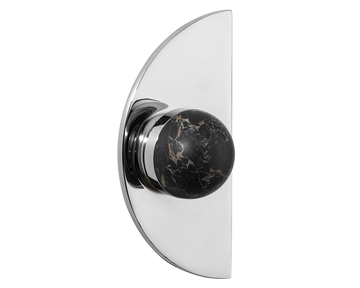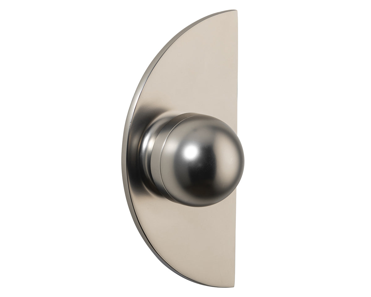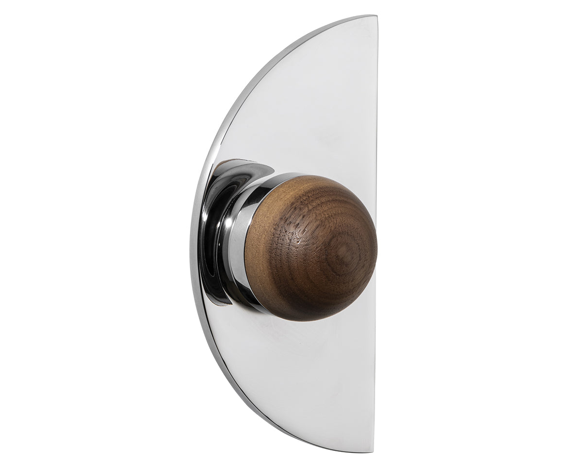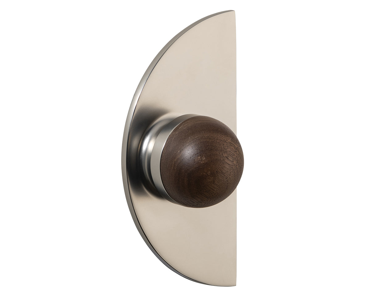 The Hemispheres Half Moon Doorknob is designed by the New York interiors firm Civilian, for the Australian premium hardware company Bankston. It's a latching fixture that pairs a hemispherical knob with a minimalist semicircular backplate that heightens its visual impact. It's available in a choice of 3 backplate finishes (polished chrome, bone powdercoat, or satin nickel) and 5 knob materials (Portoro gold marble, solid walnut, polished chrome, bone powdercoat, or satin nickel), all of which are made to the highest quality standards.