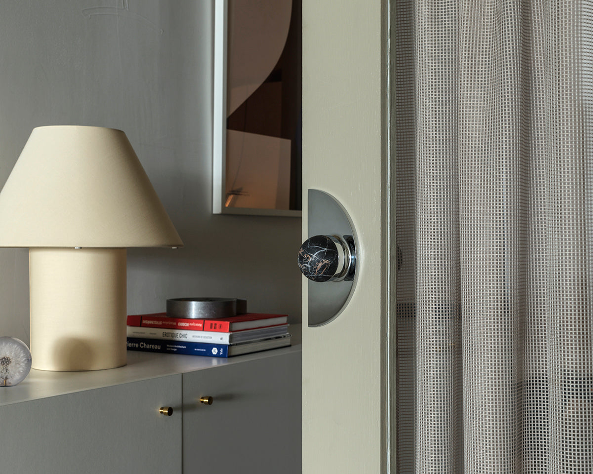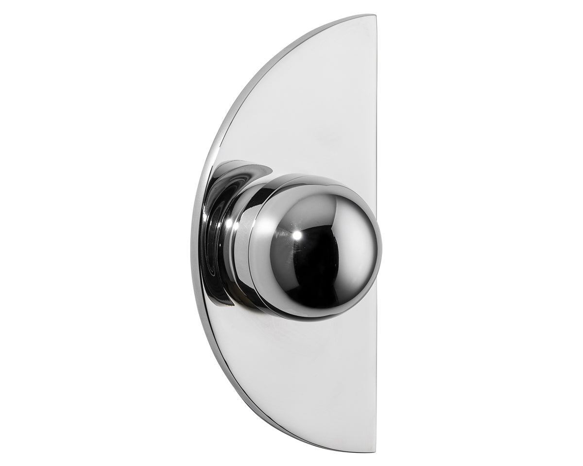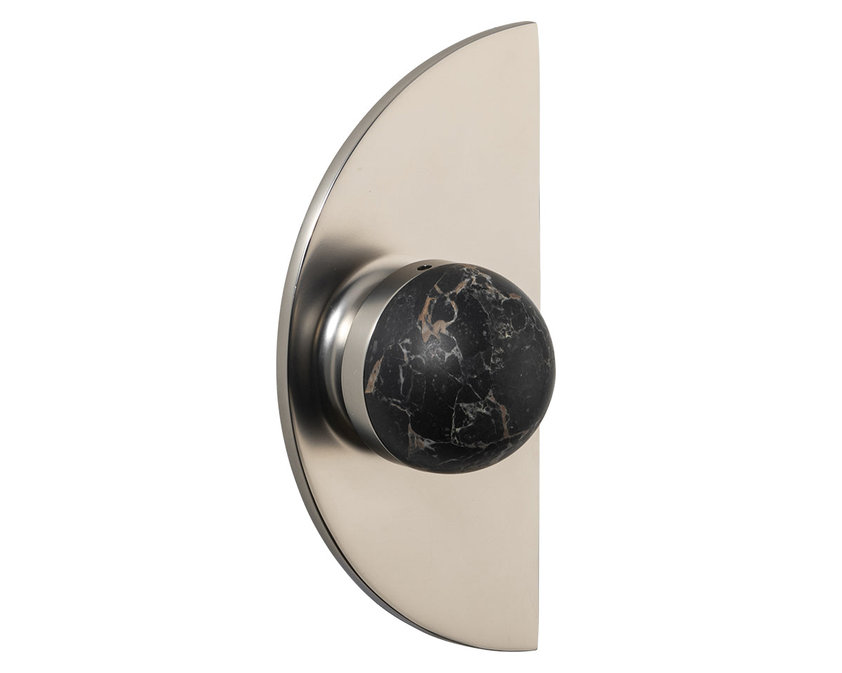 The Hemispheres Half Moon Doorknob is designed by the New York interiors firm Civilian, for the Australian premium hardware company Bankston. It's a latching fixture that pairs a hemispherical knob with a minimalist semicircular backplate that heightens its visual impact. It's available in a choice of 3 backplate finishes (polished chrome, bone powdercoat, or satin nickel) and 5 knob materials (Portoro gold marble, solid walnut, polished chrome, bone powdercoat, or satin nickel), all of which are made to the highest quality standards.