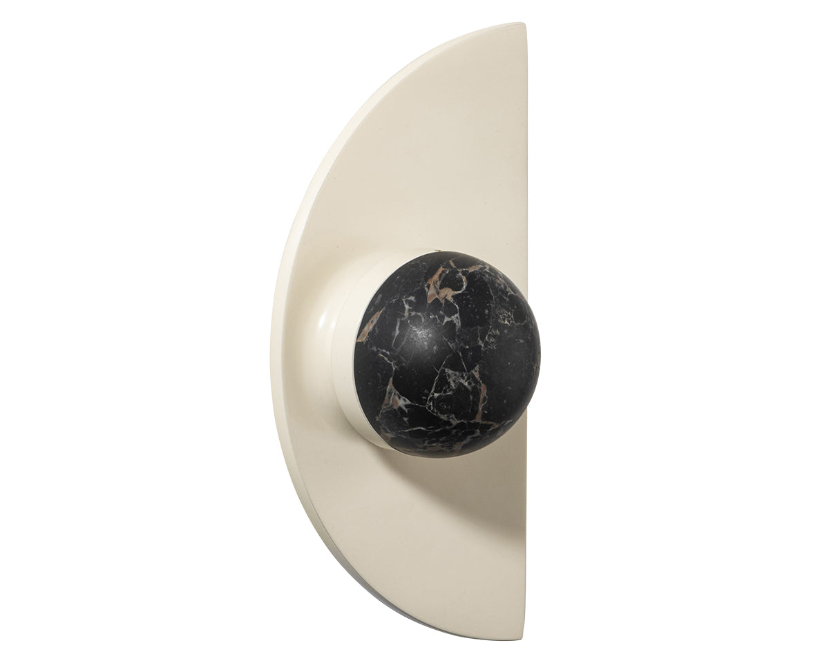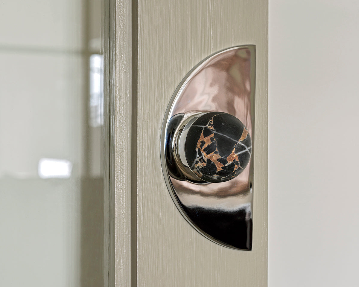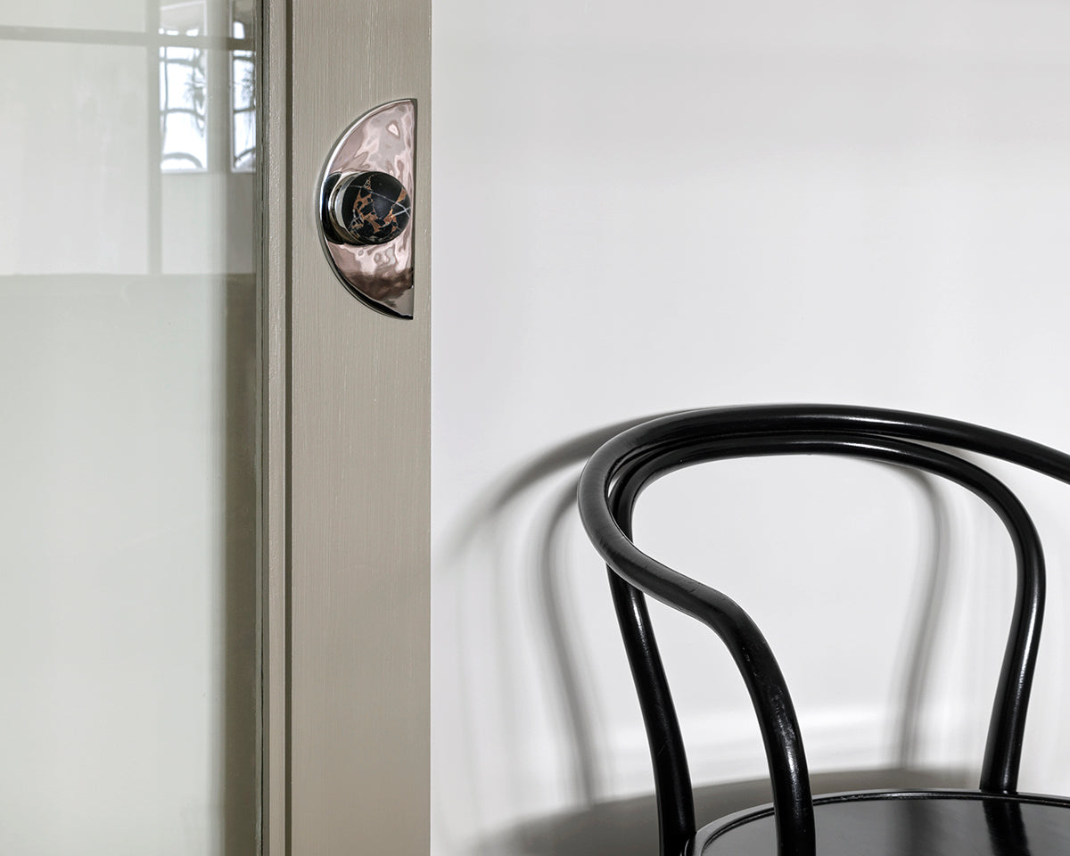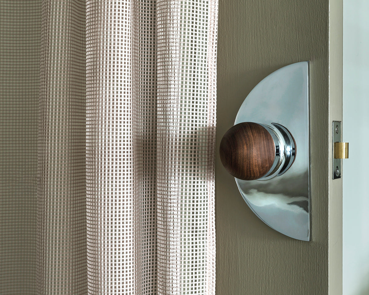 The Hemispheres Half Moon Doorknob is designed by the New York interiors firm Civilian, for the Australian premium hardware company Bankston. It's a latching fixture that pairs a hemispherical knob with a minimalist semicircular backplate that heightens its visual impact. It's available in a choice of 3 backplate finishes (polished chrome, bone powdercoat, or satin nickel) and 5 knob materials (Portoro gold marble, solid walnut, polished chrome, bone powdercoat, or satin nickel), all of which are made to the highest quality standards.
