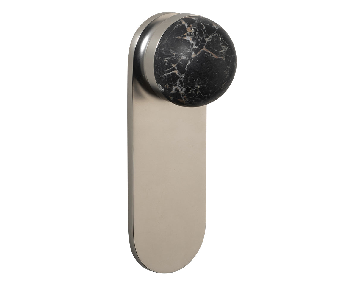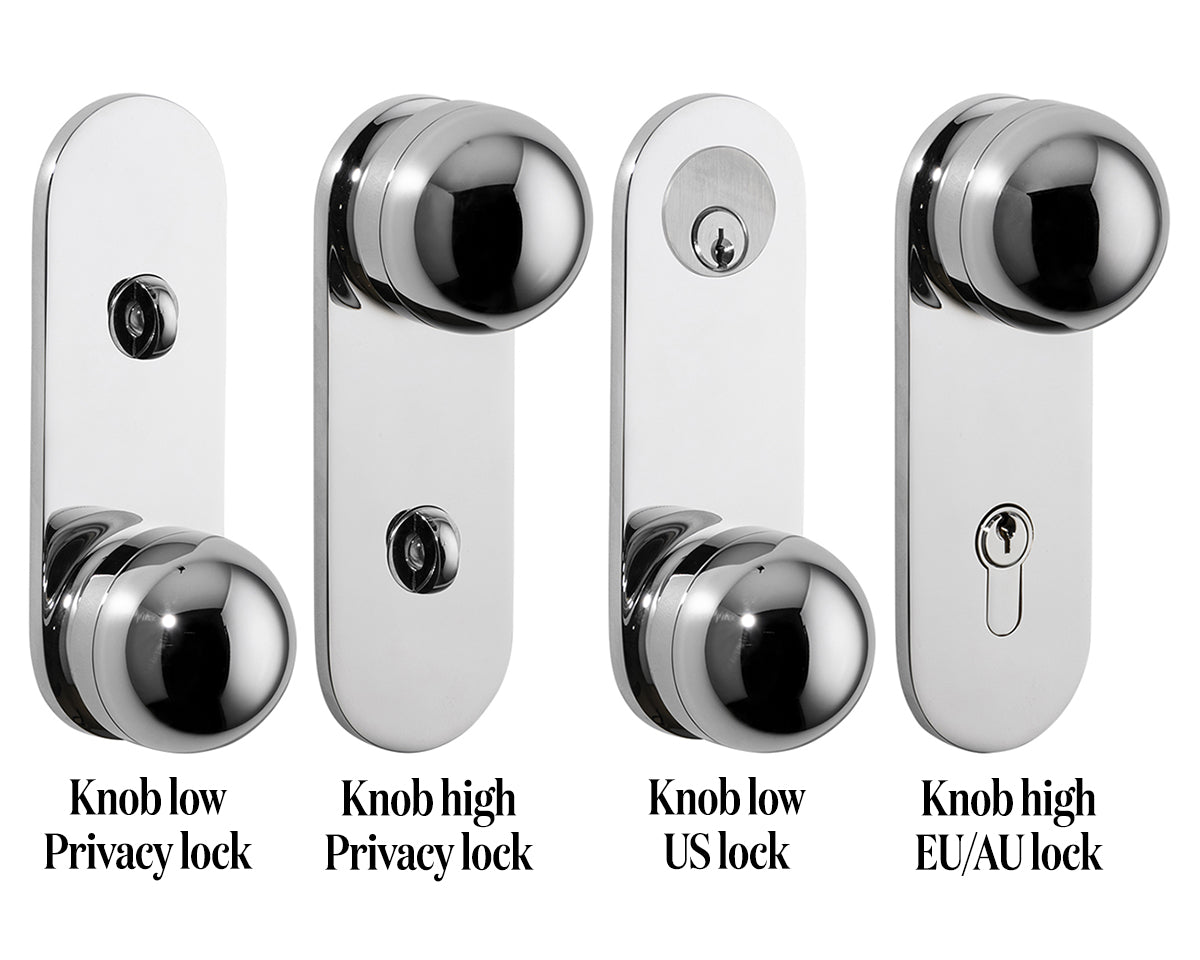Hemispheres Oval is available in a choice of 3 backplate finishes (polished chrome, bone powdercoat, or satin nickel) and 5 knob materials (Portoro gold marble, solid walnut, polished chrome, bone powdercoat, or satin nickel). It's available as a passage set (non-locking), privacy set (included thumb turn lock, matching finish), or entrance set (with a lock-ready cutout in either the elongated EU/AU or circular US style); please reference photo diagrams for available lock types and appearances. Walnut knob not recommended for use on external doors.