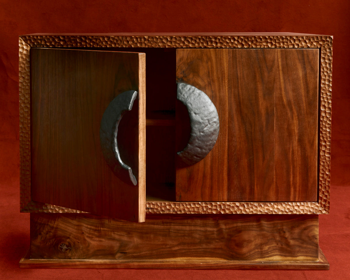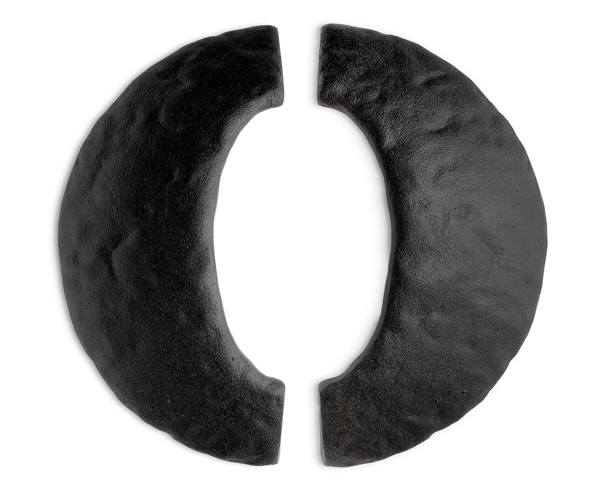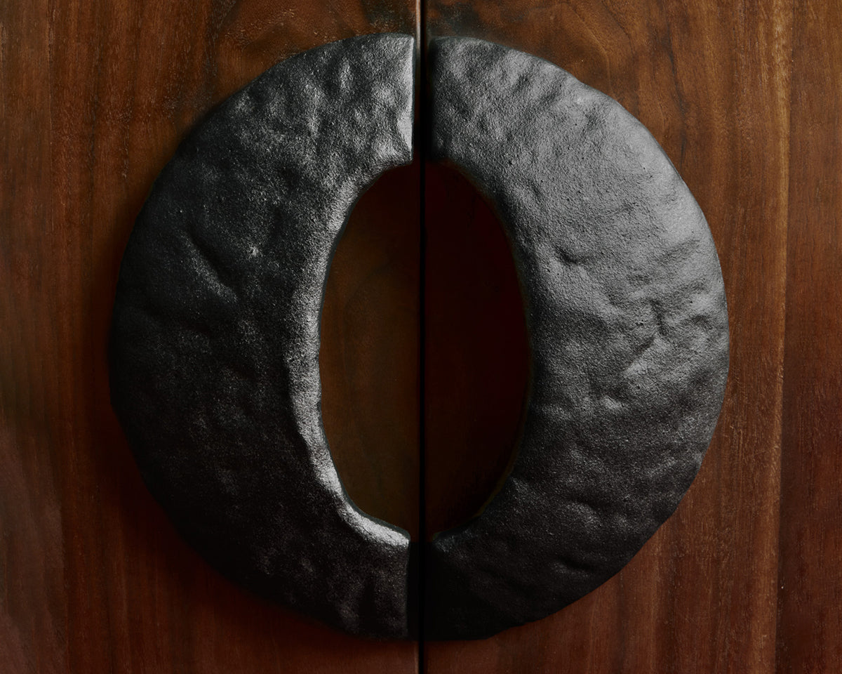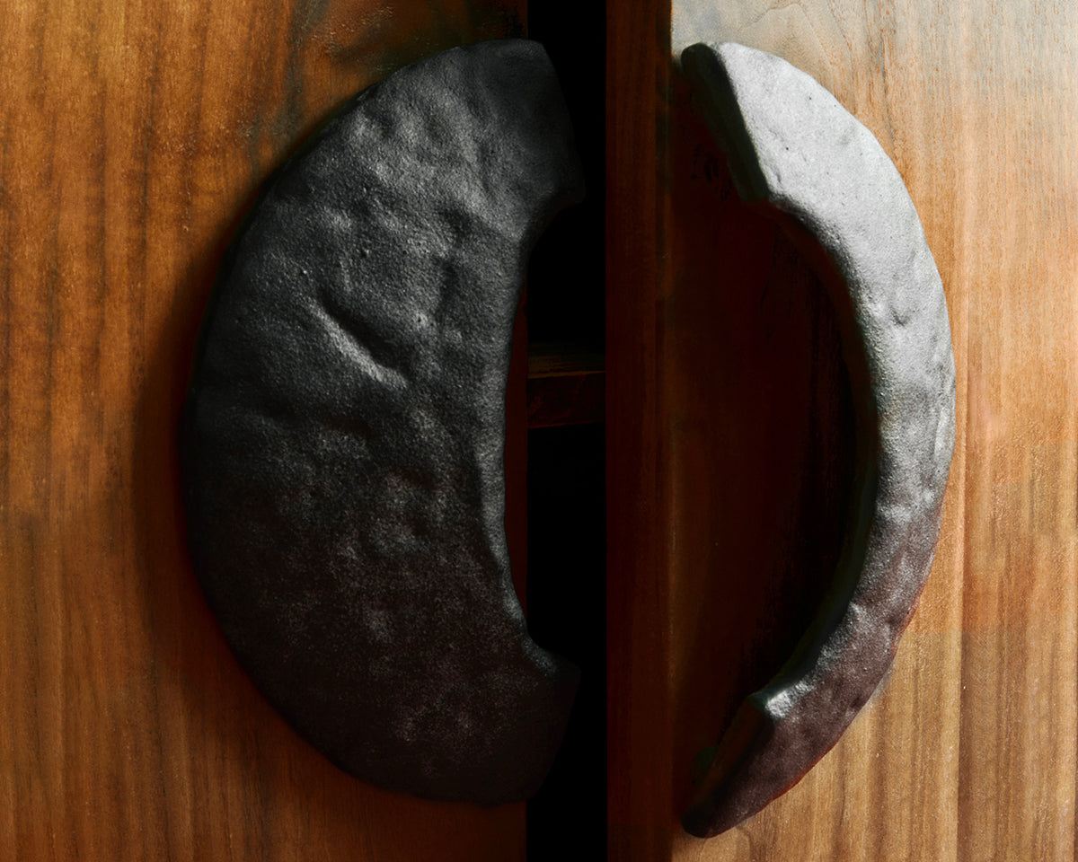 This heavy, oversized set of pulls is designed to be used on double doors or cabinets. The forms were hand-sculpted by Mike Ruiz Serra in his New York studio, are sand-cast in iron, and are finished with a black oxide solution and wax. Serra Hardware products are characterized by their crude texture and irregular forms. The original finish of the iron may wear and oxidize over time to reveal a distinctive patina; if preferred, use a quality metal wax to restore a consistent black finish. Each pull in the set weighs 7.5 pounds.