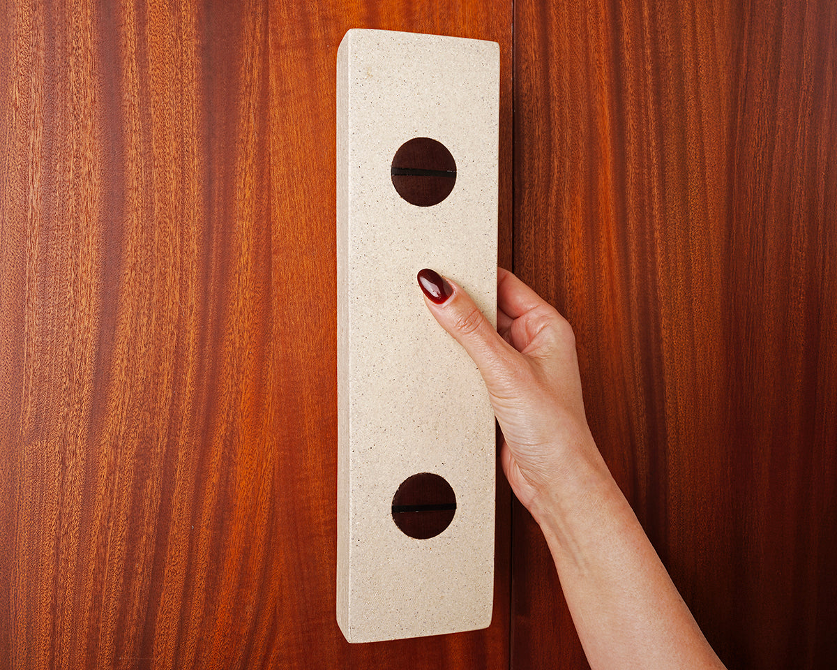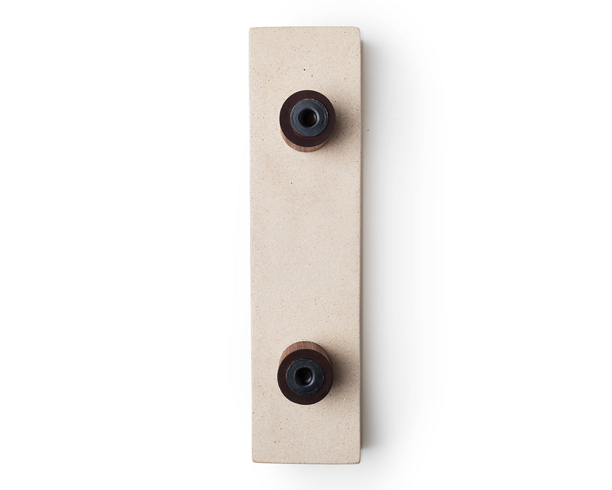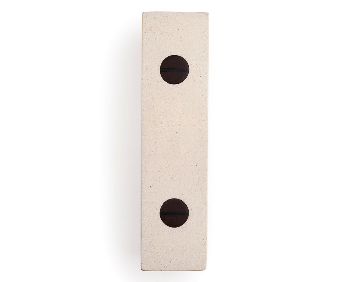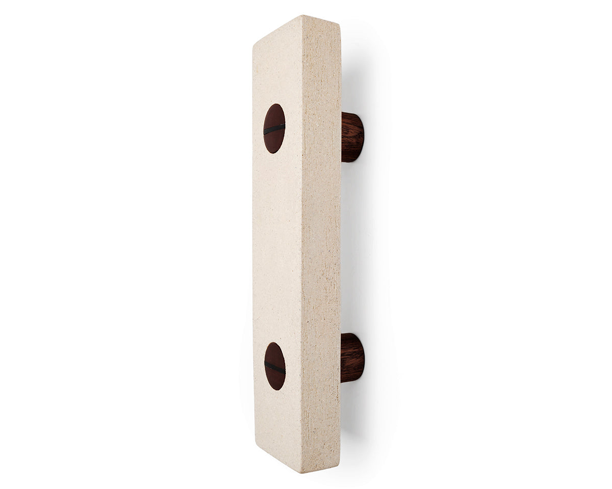 Handmade from clay and anchored with solid mahogany tenons, this large-scale door handle by Brooklyn designer N Shook is a bold architectural gesture. The simple, substantial form highlights the natural strength and texture of the materials, while small ebony wedges on the front of each "bolt" add a quiet but deliberate detail. The body of the handle is an unglazed, polished ceramic.