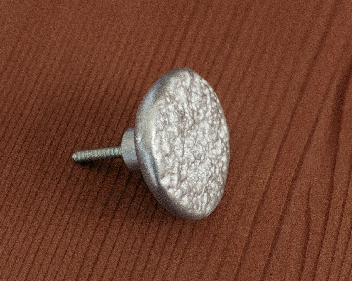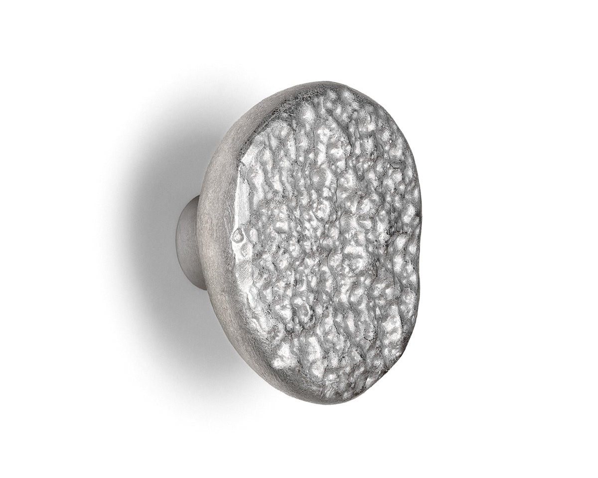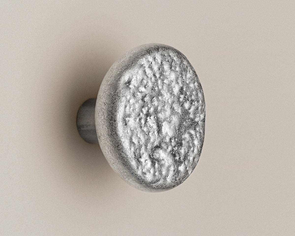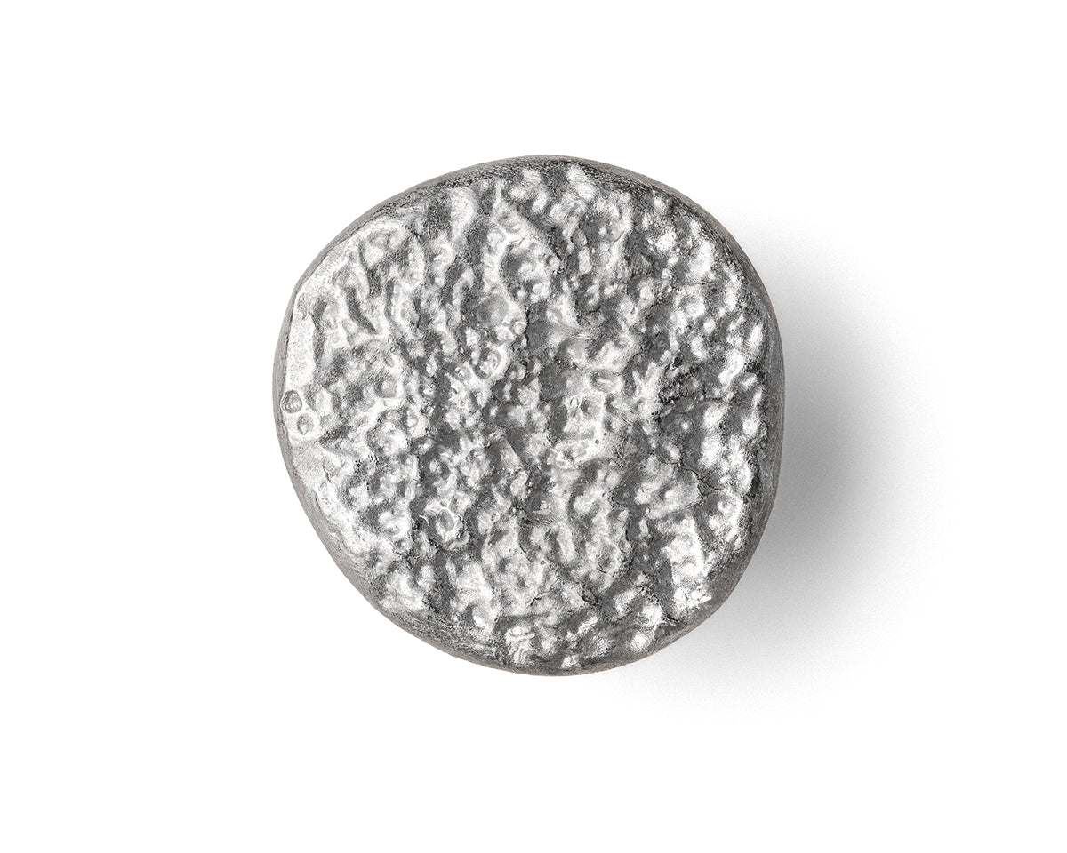 Each Puddle Knob’s shape is crafted by the surface tension of a molten metal drop, leaving a distinctive cratered surface imprinted by the sand beneath. Made with recycled aluminum by San Francisco studio Hayesmade, every piece is hand-poured, resulting in unique shapes and sizes. NOTE: Pictured in the images with a hand is the large-size Puddle.