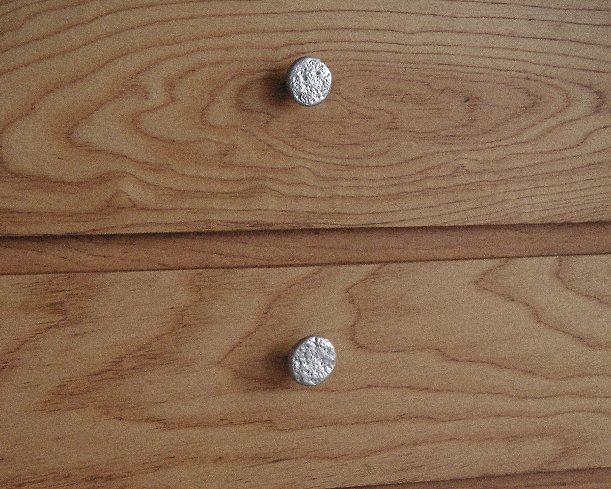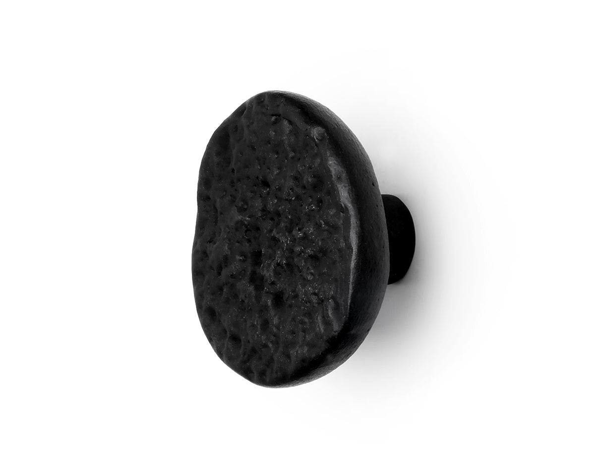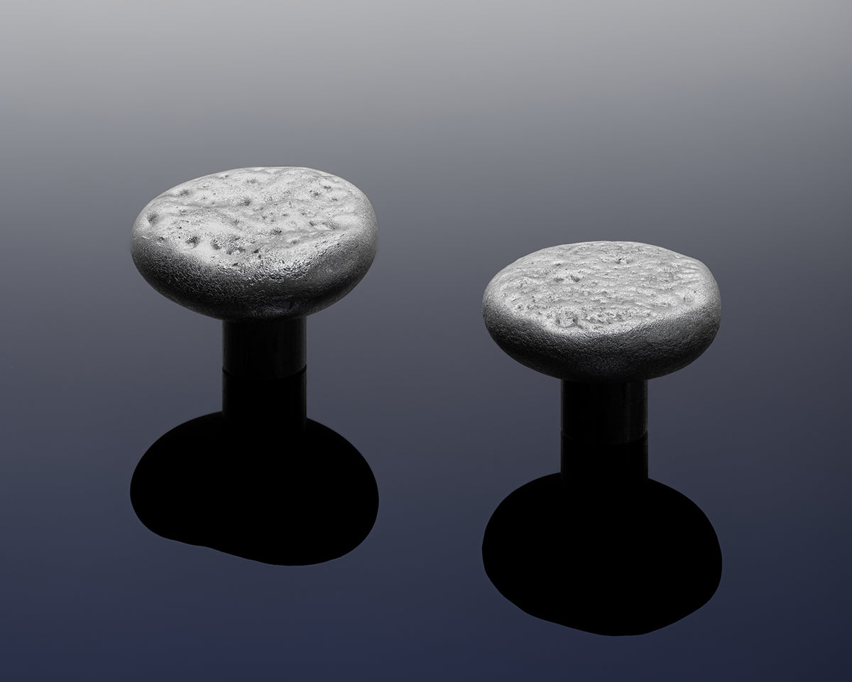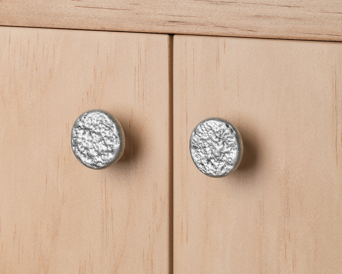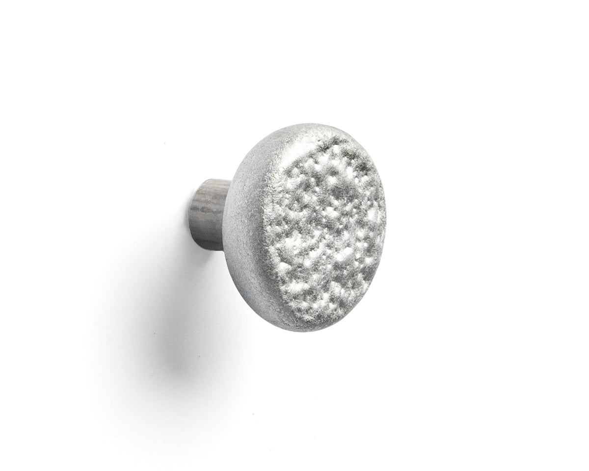 Each Puddle Knob’s shape is crafted by the surface tension of a molten metal drop, leaving a distinctive cratered surface imprinted by the sand beneath. Made with recycled aluminum by San Francisco studio Hayesmade, every piece is hand-poured, resulting in unique shapes and sizes. NOTE: Pictured in the images with a hand is the large-size Puddle.
