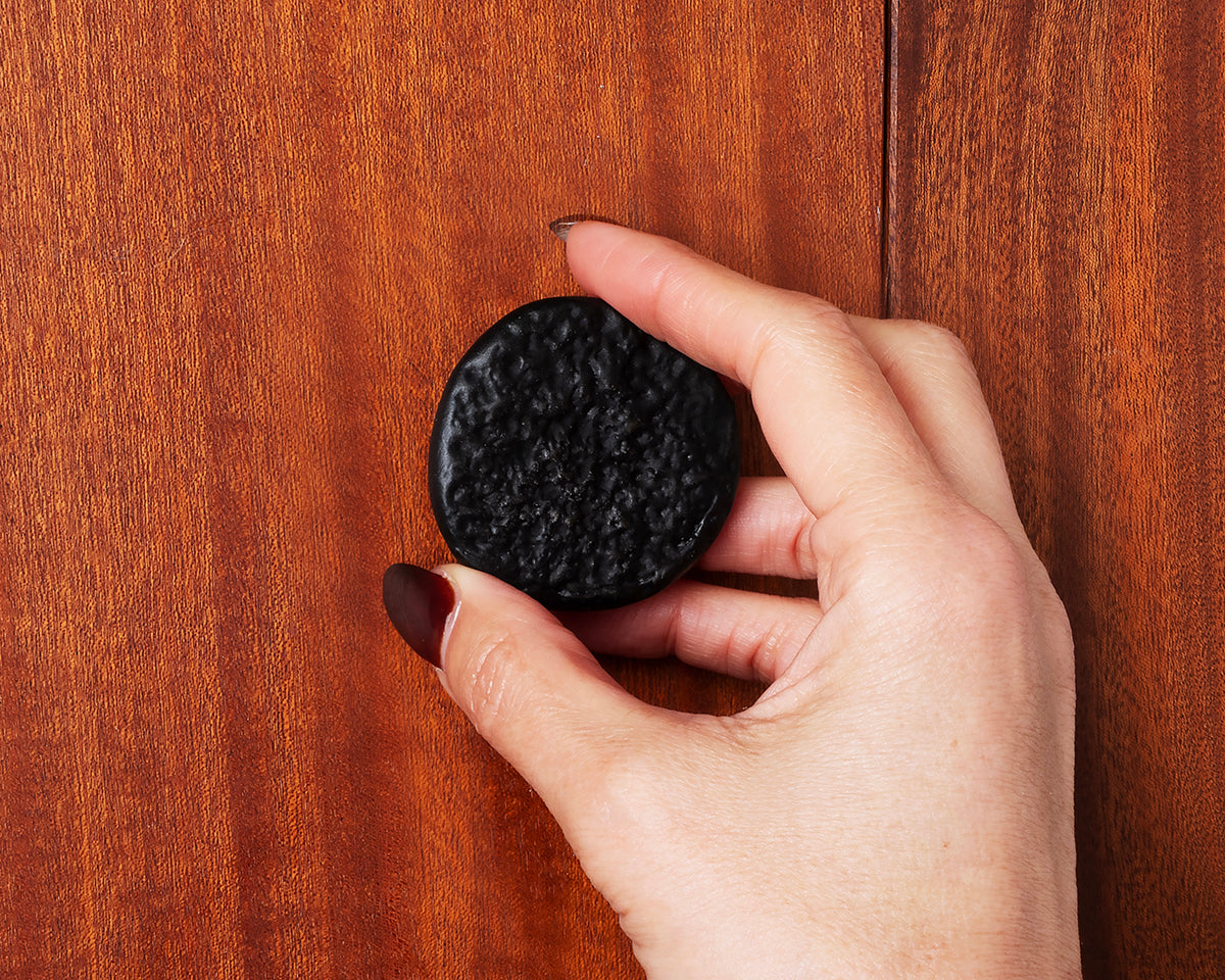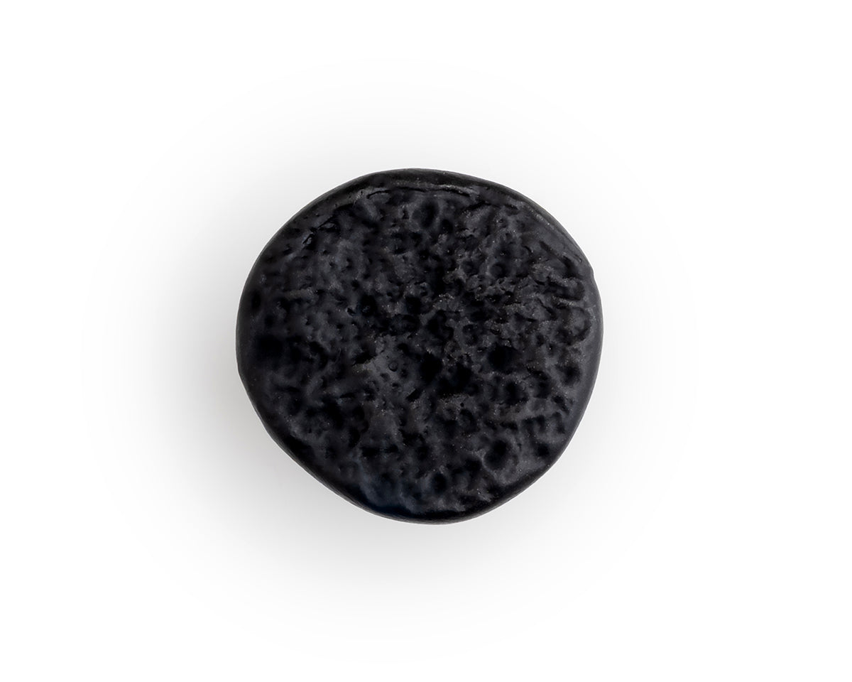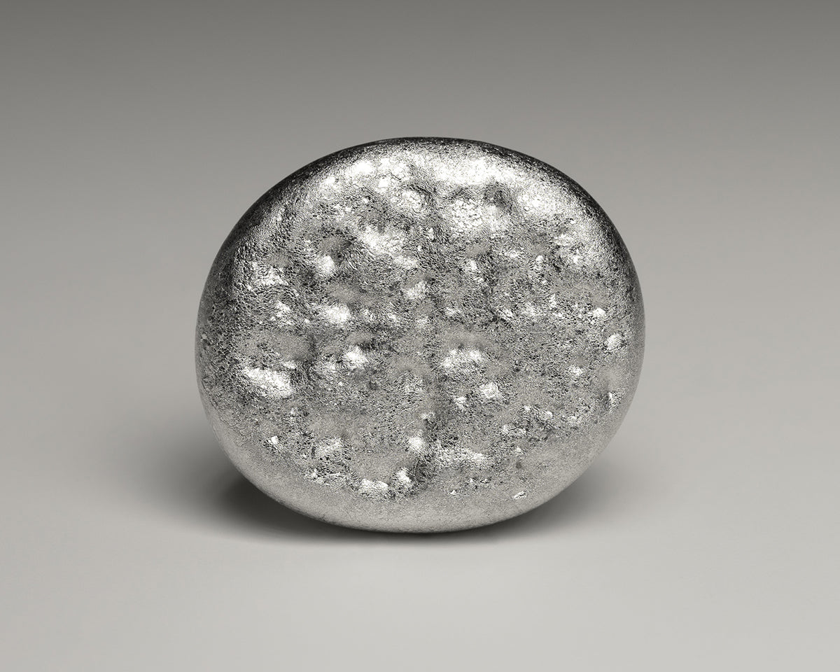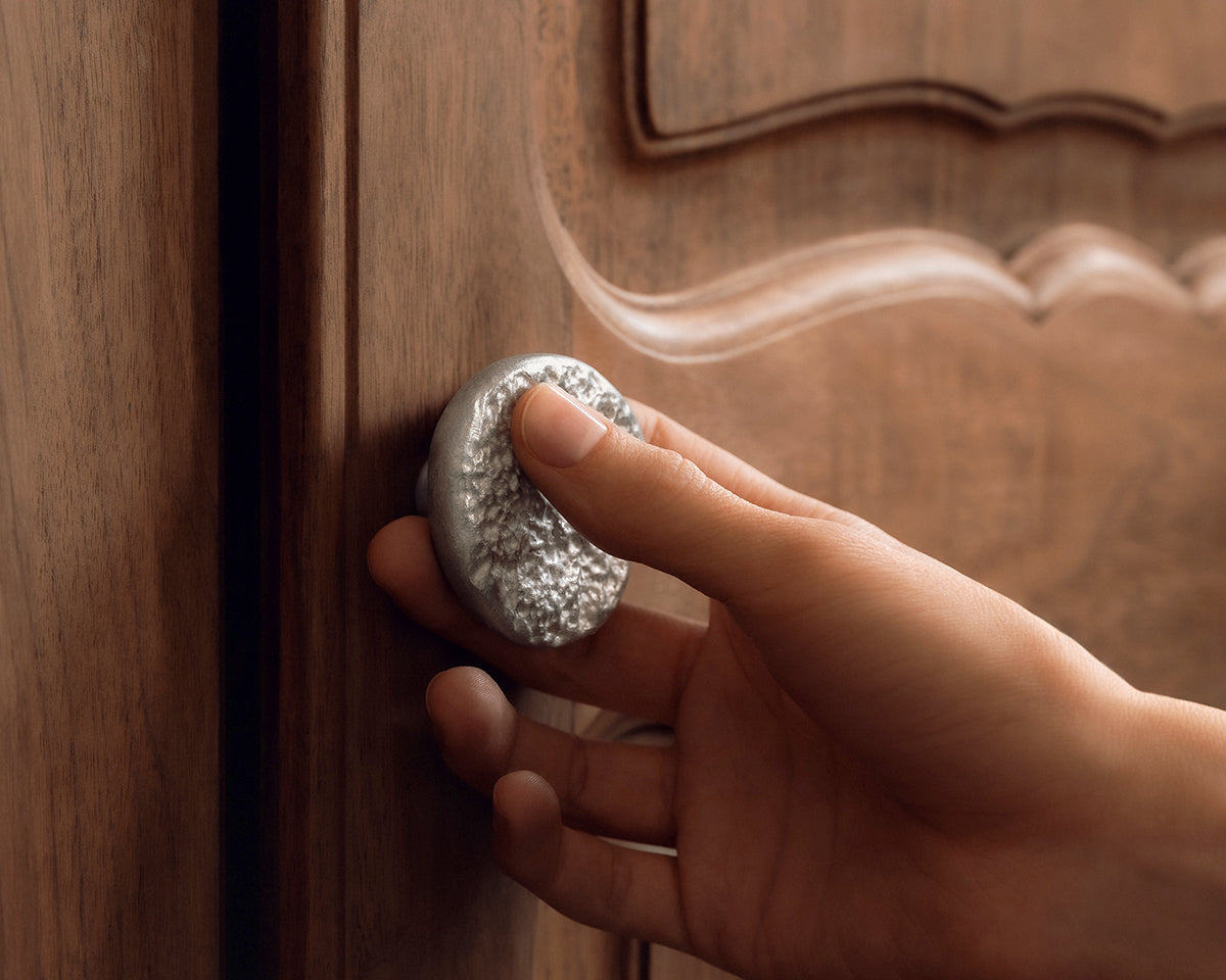Each Puddle Knob’s shape is crafted by the surface tension of a molten metal drop, leaving a distinctive cratered surface imprinted by the sand beneath. Made with recycled aluminum by San Francisco studio Hayesmade, every piece is hand-poured, resulting in unique shapes and sizes. NOTE: Pictured in the images with a hand is the large-size Puddle.
