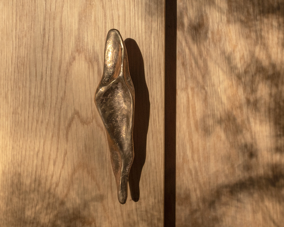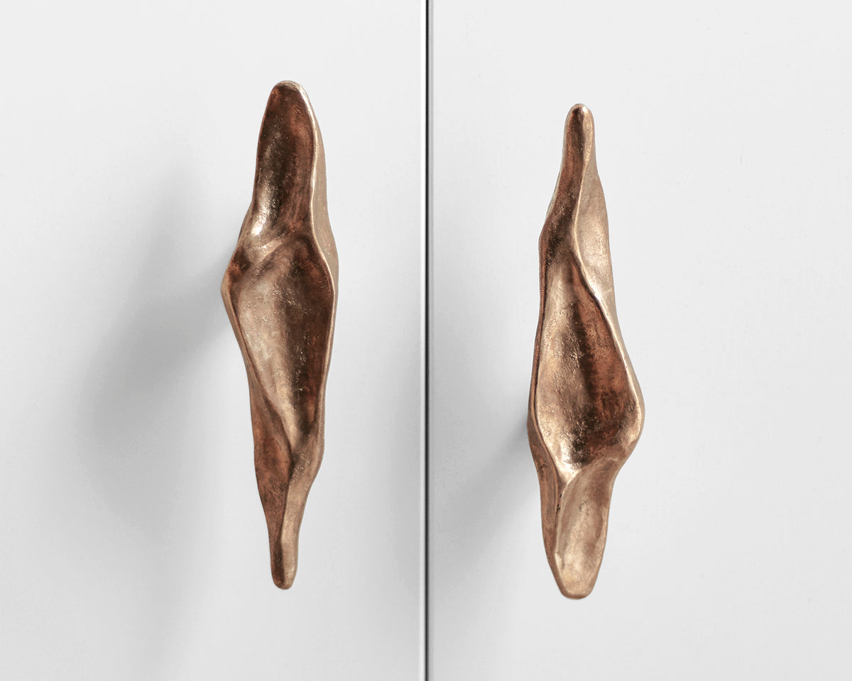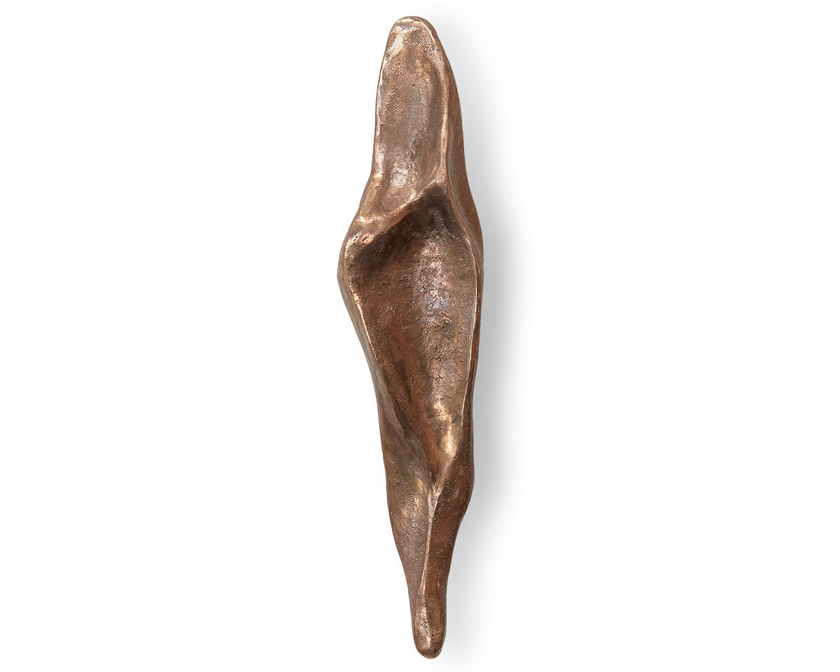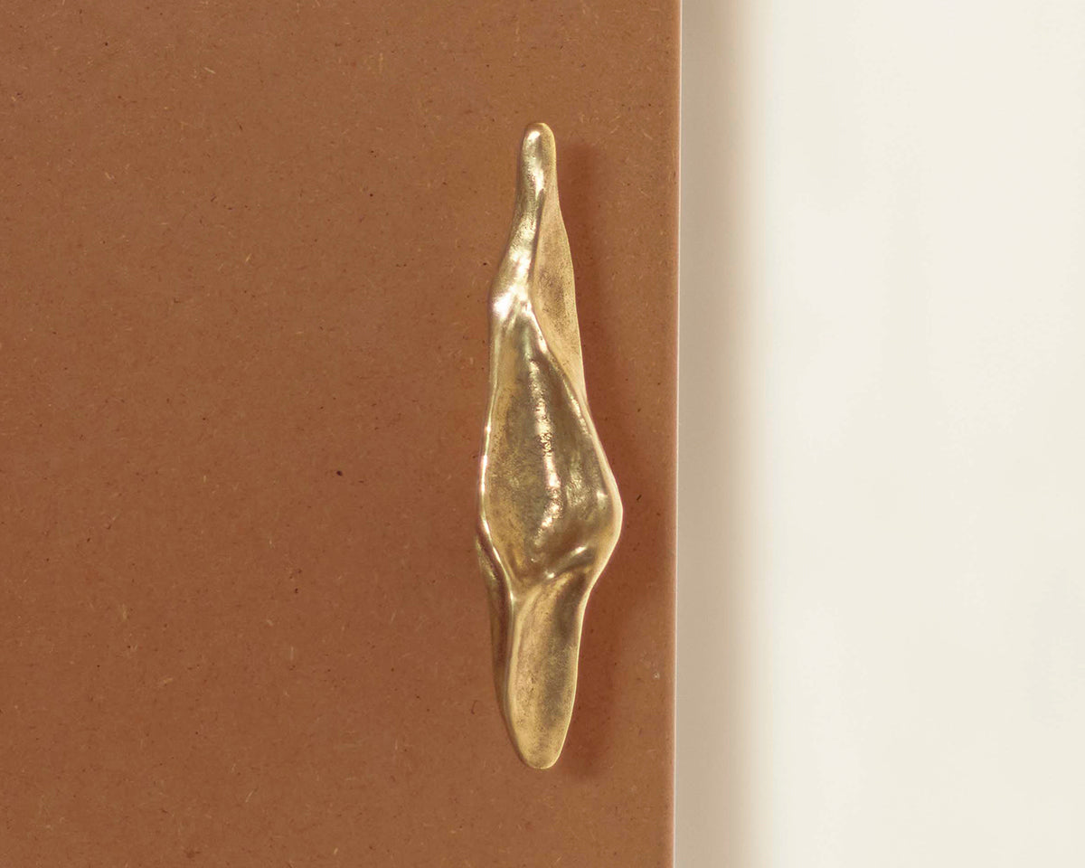 The Pinch collection by Budapest studio Evaanna disrupts the clean lines of a modern space or furniture piece with an organic form that channels the aesthetic of mid-century sculptors like Henry Moore. The elongated Gentle Pinch can be purchased in one of two styles: a single pull that can be mounted on a cabinet, or a pair of pulls, with set screws, that can be double-backed on a door — including sliding doors. Each of the collection's forms has been hand-shaped in clay by architect and metalsmith Eva Ana Gulacsi, and cast by a family-run foundry in Budapest in either bronze or brass. Both materials will naturally darken and develop a patina over time.