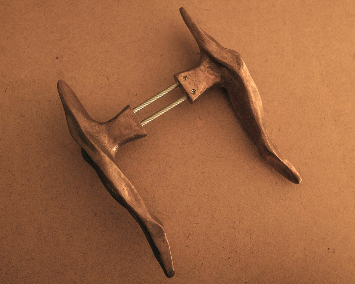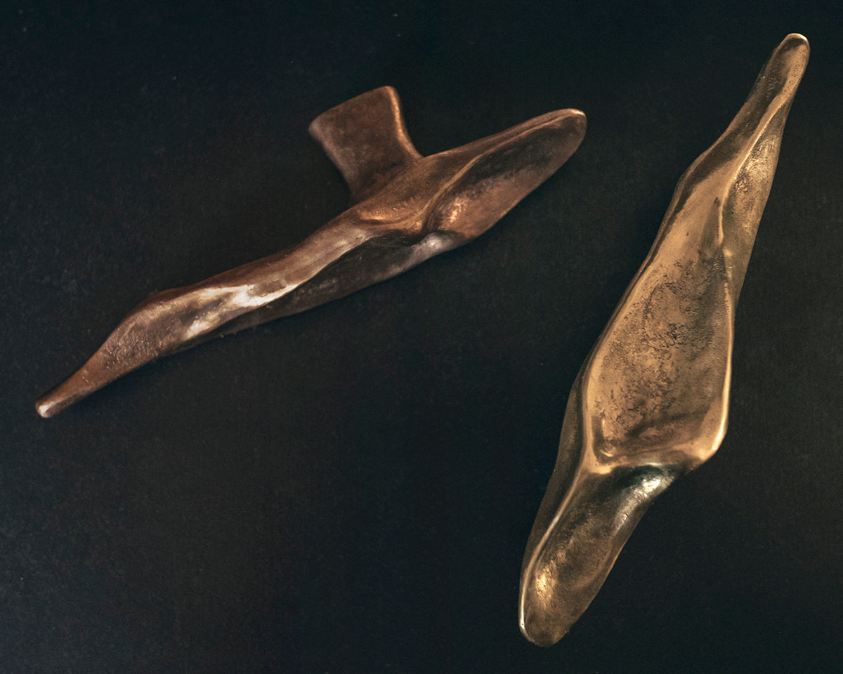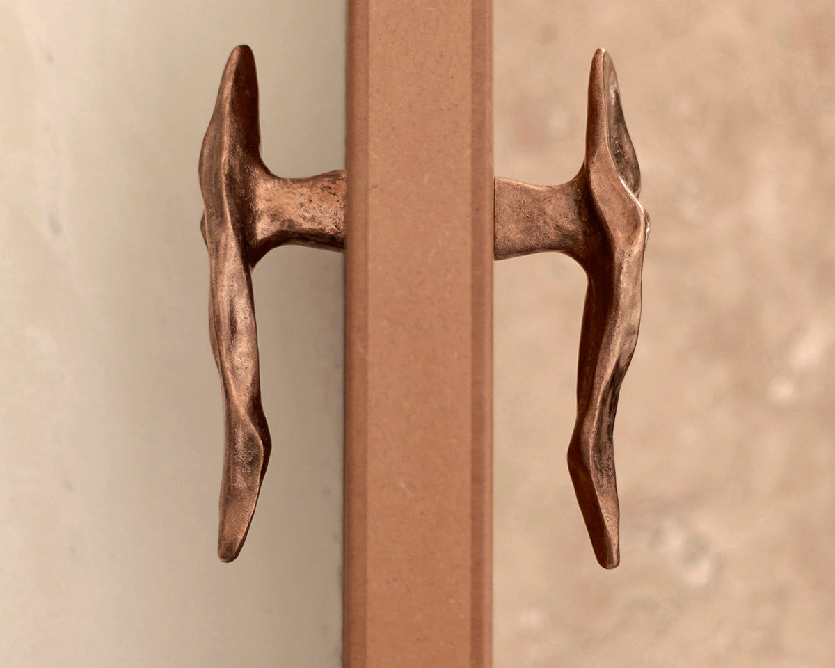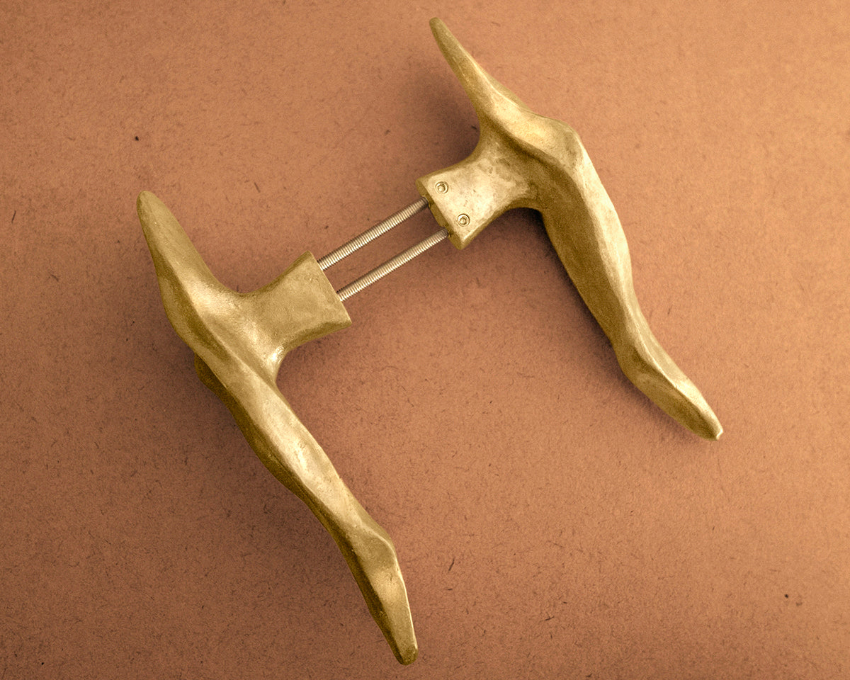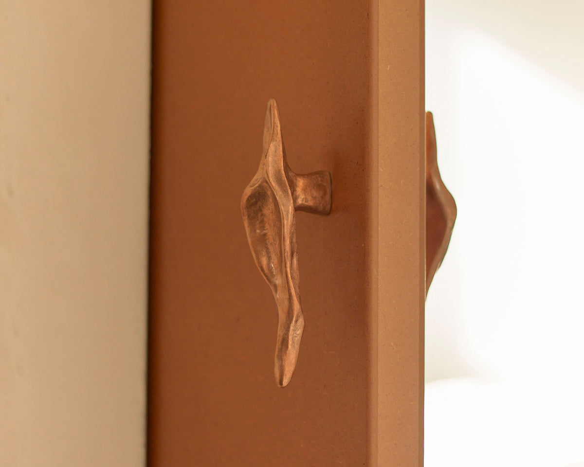 The Pinch collection by Budapest studio Evaanna disrupts the clean lines of a modern space or furniture piece with an organic form that channels the aesthetic of mid-century sculptors like Henry Moore. The elongated Gentle Pinch can be purchased in one of two styles: a single pull that can be mounted on a cabinet, or a pair of pulls, with set screws, that can be double-backed on a door — including sliding doors. Each of the collection's forms has been hand-shaped in clay by architect and metalsmith Eva Ana Gulacsi, and cast by a family-run foundry in Budapest in either bronze or brass. Both materials will naturally darken and develop a patina over time.