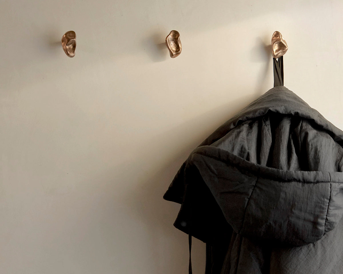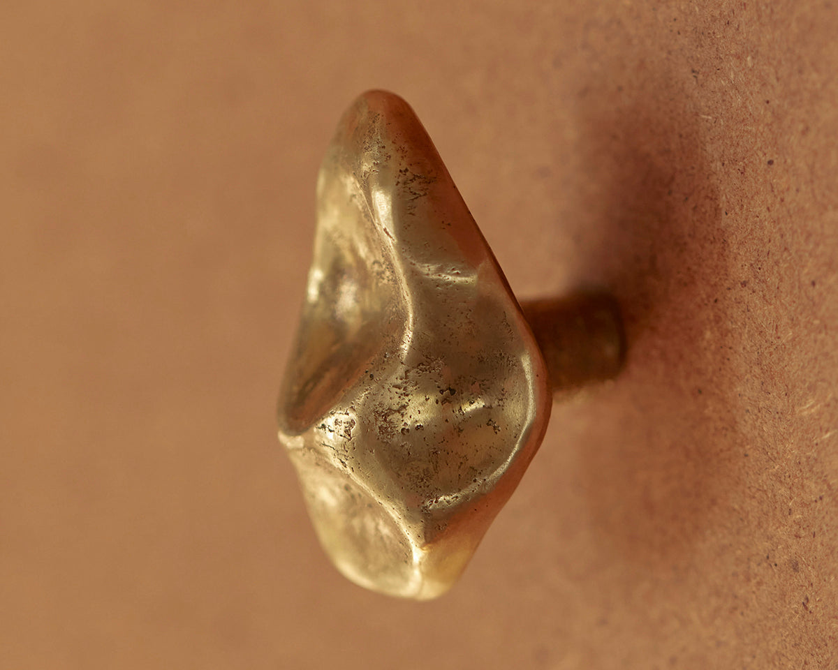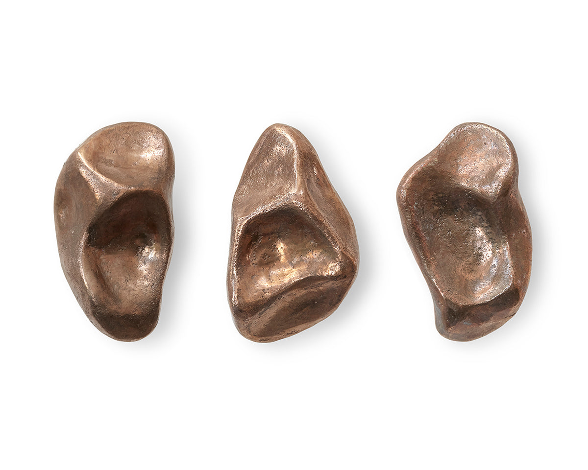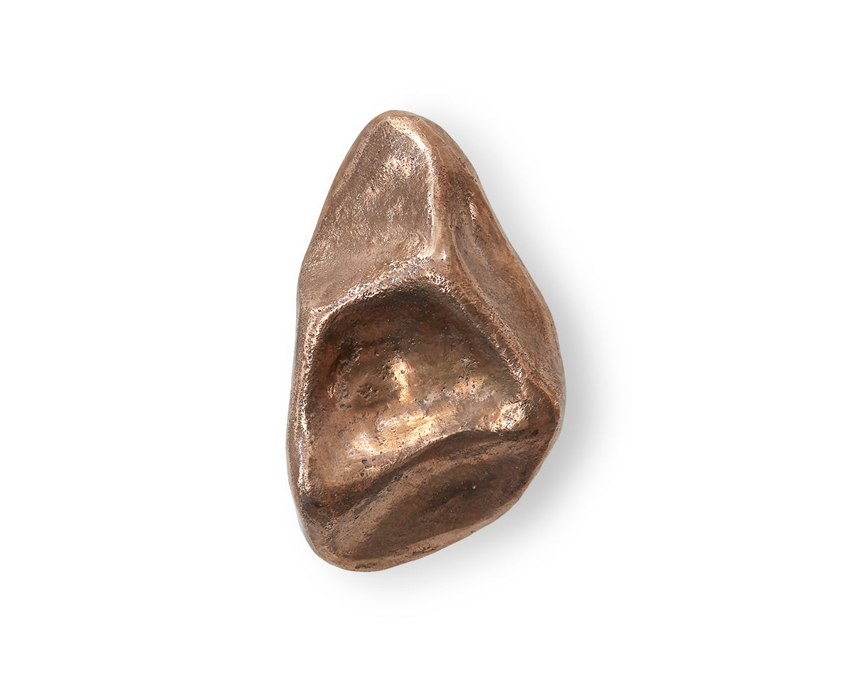 The Pinch hook/knob collection by Budapest studio Evaanna disrupts the clean lines of a modern space or furniture piece with an organic form that channels the aesthetic of mid-century sculptors like Henry Moore. Each of the collection's 6 shapes — 3 small, 3 large — has been hand-shaped in clay by architect and metalsmith Eva Ana Gulacsi, and cast by a family-run foundry in Budapest in either bronze or brass. Both materials will naturally darken and develop a patina over time. Pinch can be used either as a knob or a wall hook, and screws for both options are included with purchase.
