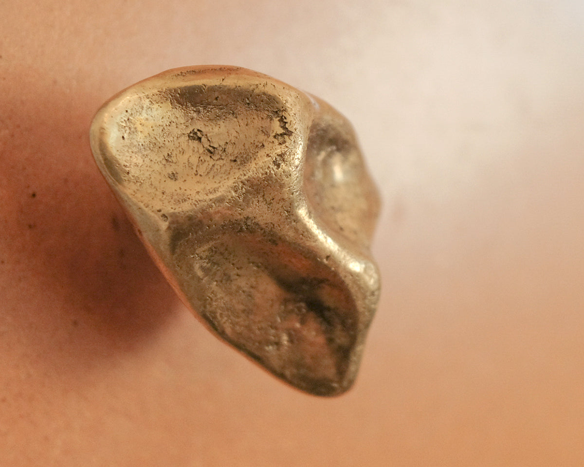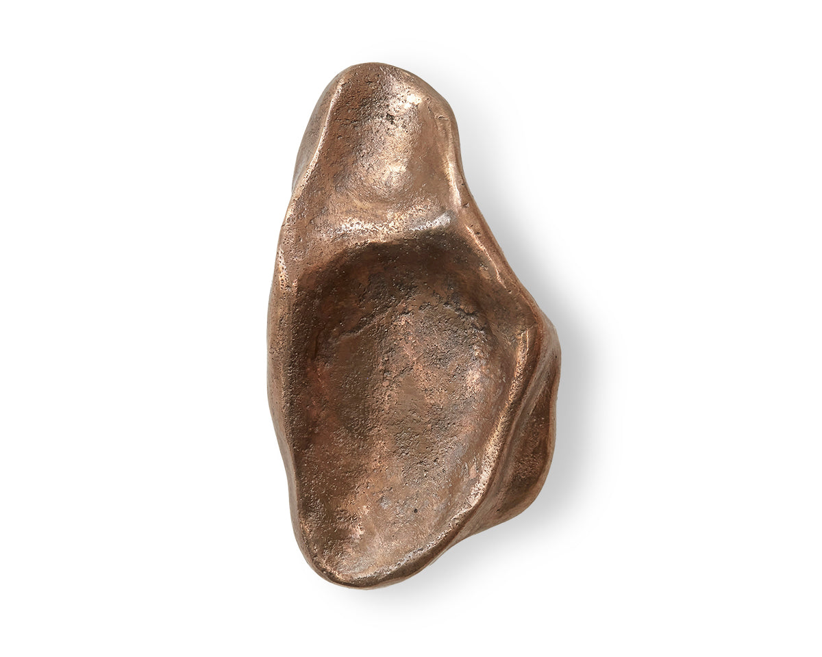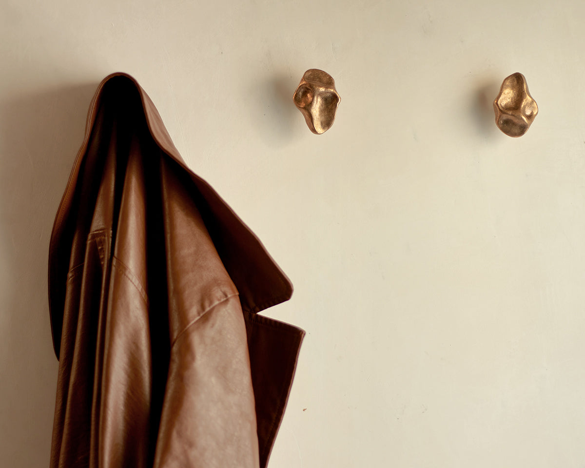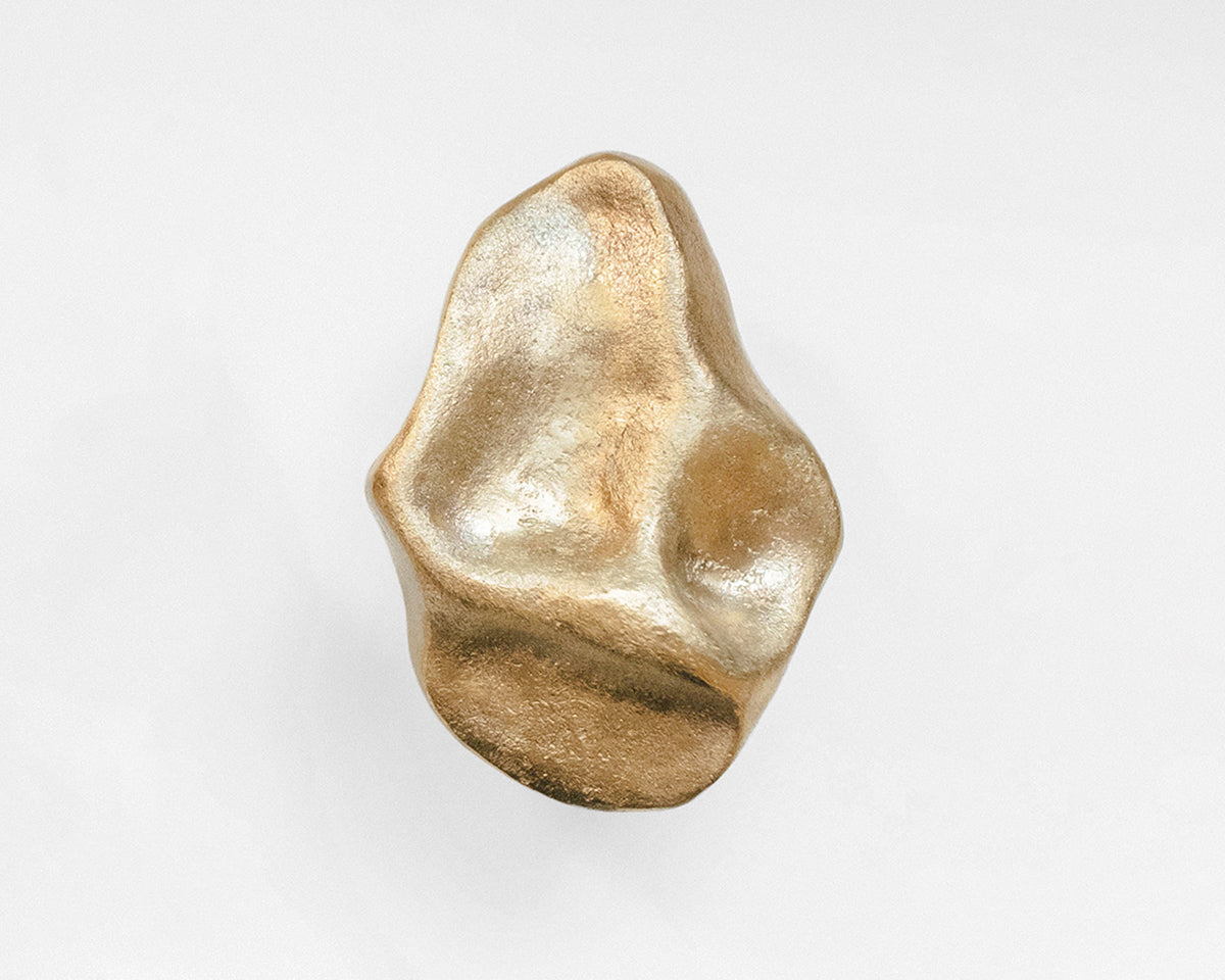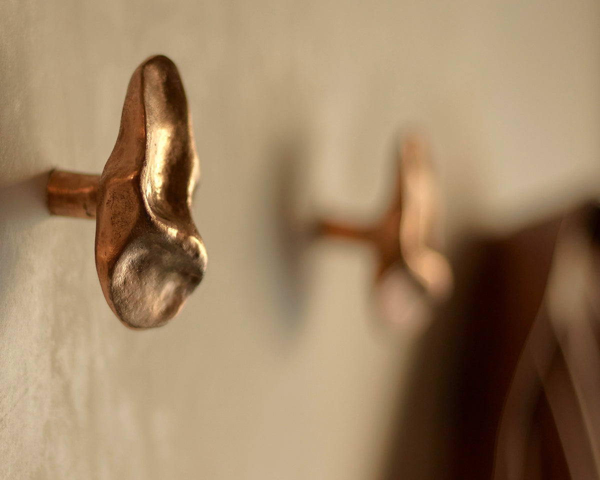 The Pinch hook/knob collection by Budapest studio Evaanna disrupts the clean lines of a modern space or furniture piece with an organic form that channels the aesthetic of mid-century sculptors like Henry Moore. Each of the collection's 6 shapes — 3 small, 3 large — has been hand-shaped in clay by architect and metalsmith Eva Ana Gulacsi, and cast by a family-run foundry in Budapest in either bronze or brass. Both materials will naturally darken and develop a patina over time. Pinch can be used either as a knob or a wall hook, and screws for both options are included with purchase.