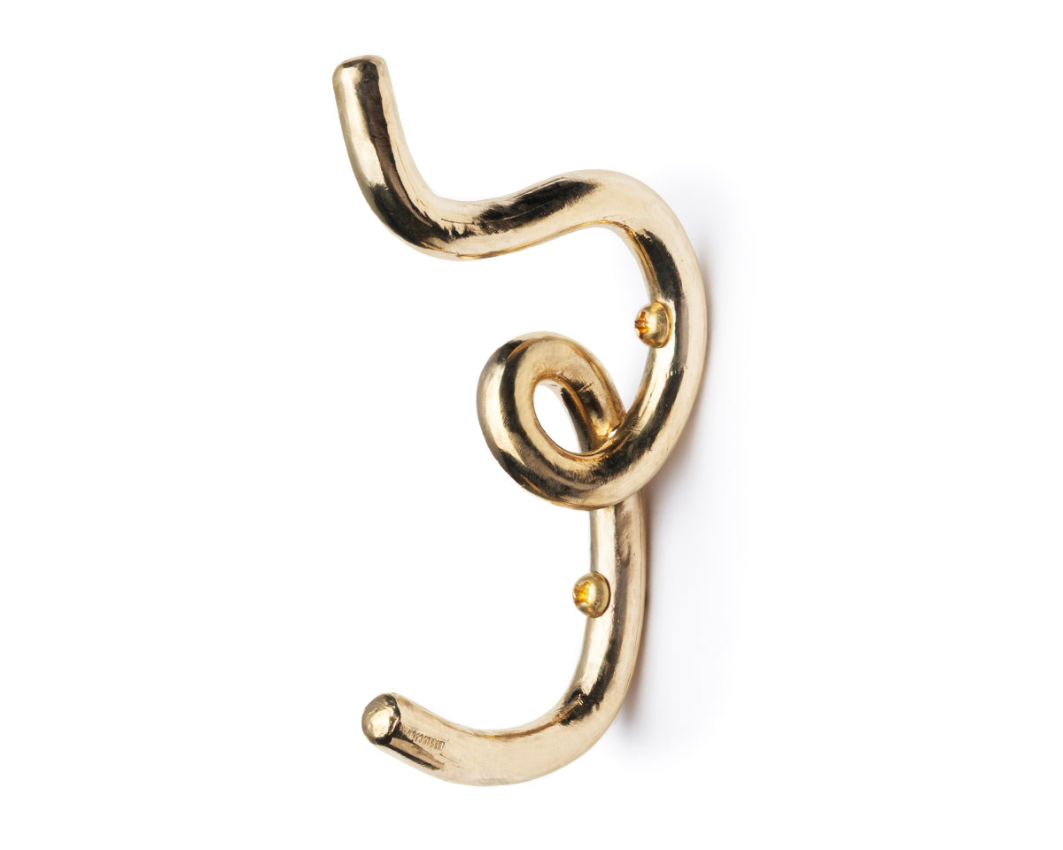 a brass rod is simply and elegantly curved over and around itself to create two extremely sturdy hooks to hang clothes or accessories on. All of Unearthen’s hardware is designed and made in California. Each piece is hand-carved from wax and sand-cast in brass using lost-wax casting methods.