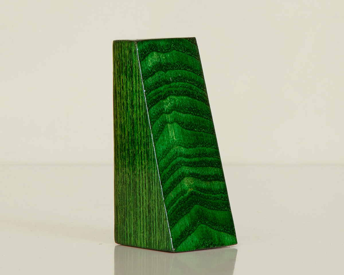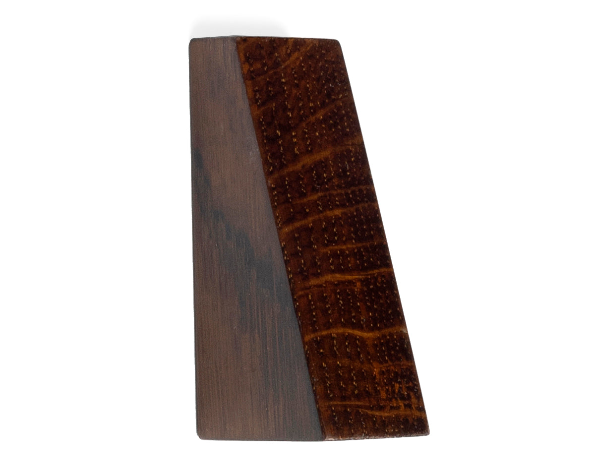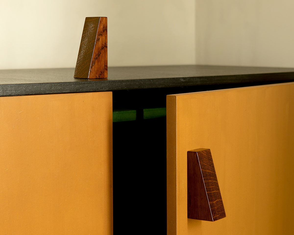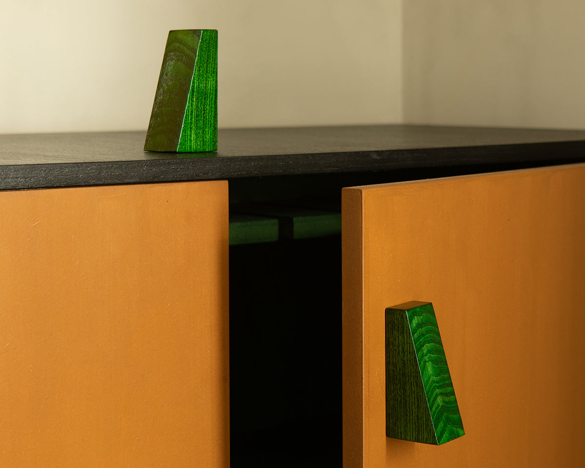 The asymmetrically protruding profile of these solid-wood handles by French designer Jonathan Cohen is inspired by the shape of a nose. Each size is available in a range of patterns and finishes. Photographed here are green ash and dark stained oak, glossy. NOTE: The color swatch images show a mix of glossy and matte finishes, with oak and fine ink shown in matte and dark stained oak, green ash, thick ink, and green ink shown in glossy.