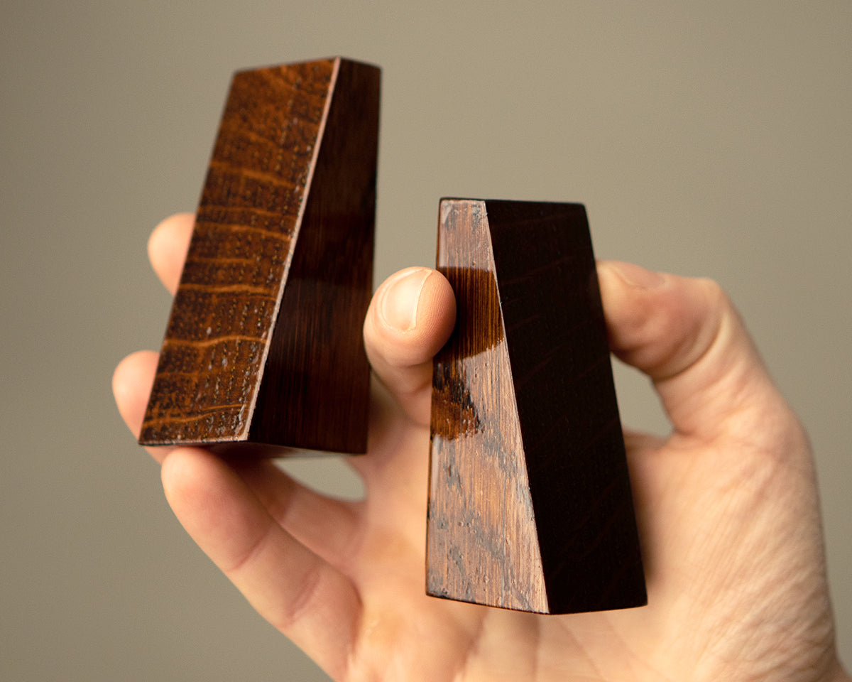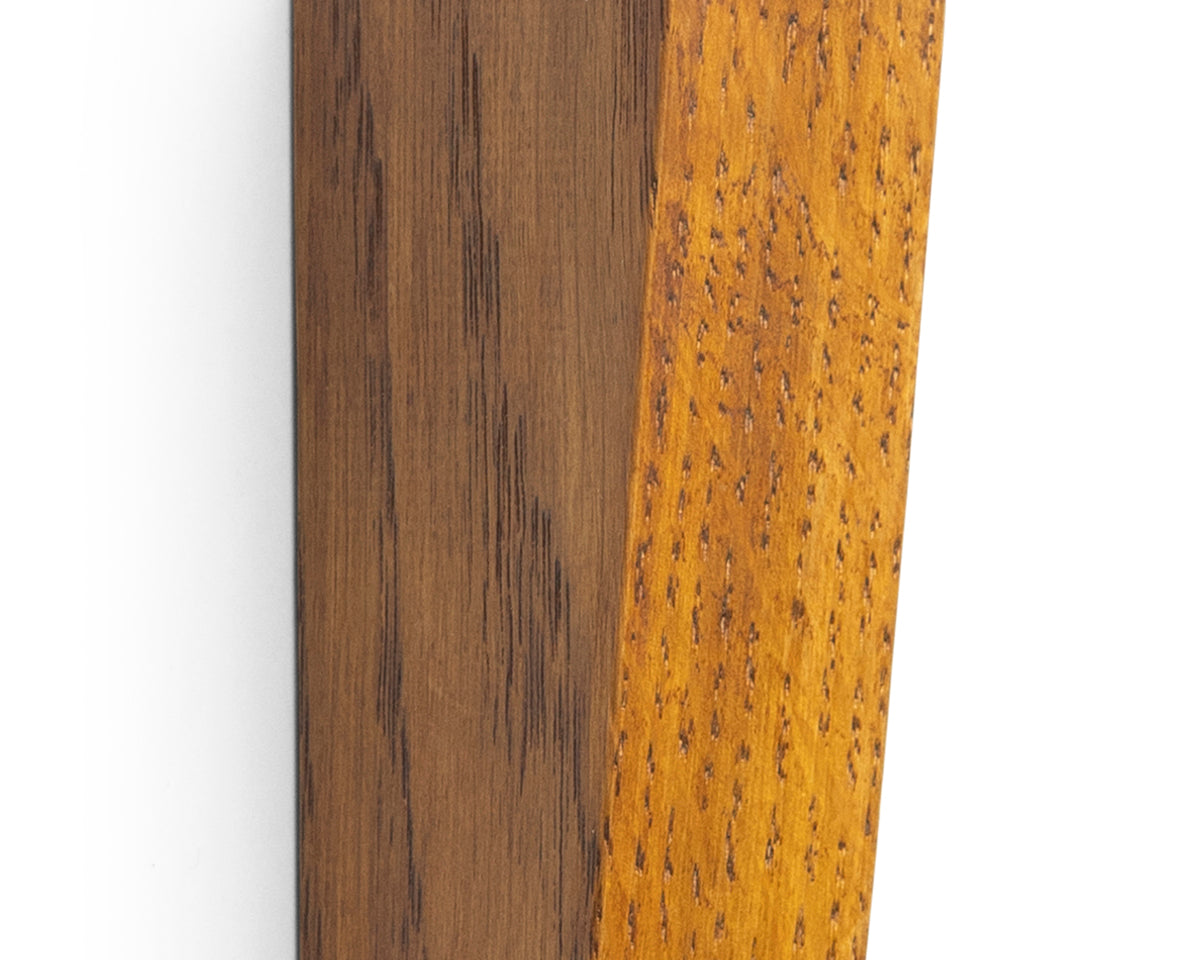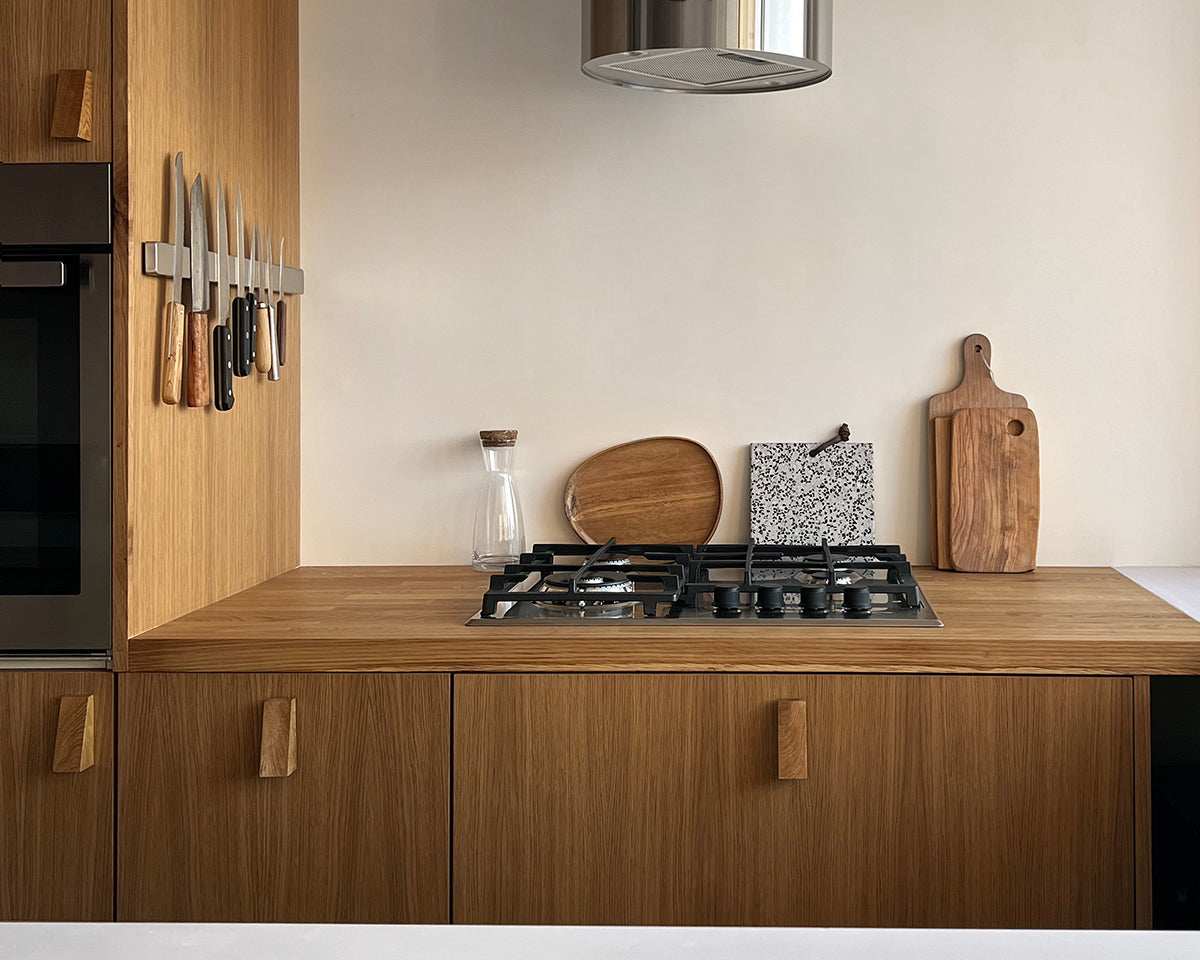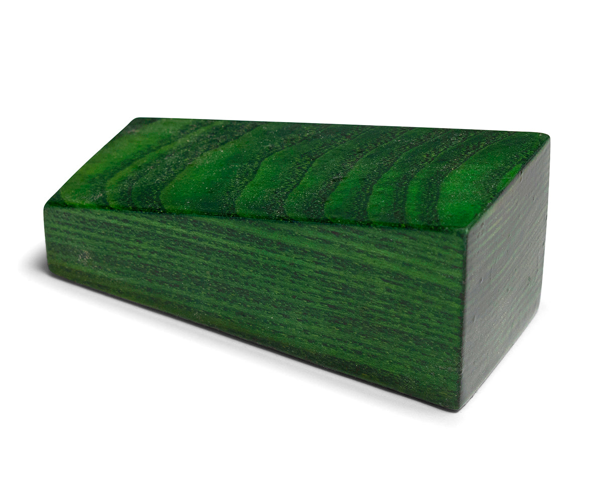 The asymmetrically protruding profile of these solid-wood handles by French designer Jonathan Cohen is inspired by the shape of a nose. Each size is available in a range of patterns and finishes. Photographed here are green ash and dark stained oak, glossy. NOTE: The color swatch images show a mix of glossy and matte finishes, with oak and fine ink shown in matte and dark stained oak, green ash, thick ink, and green ink shown in glossy.