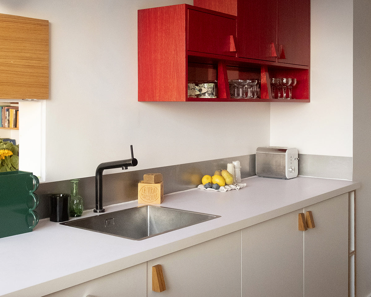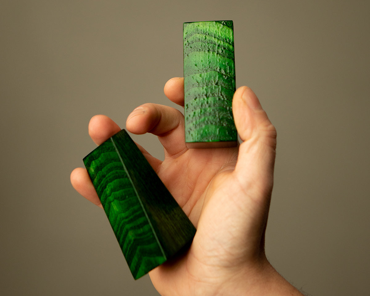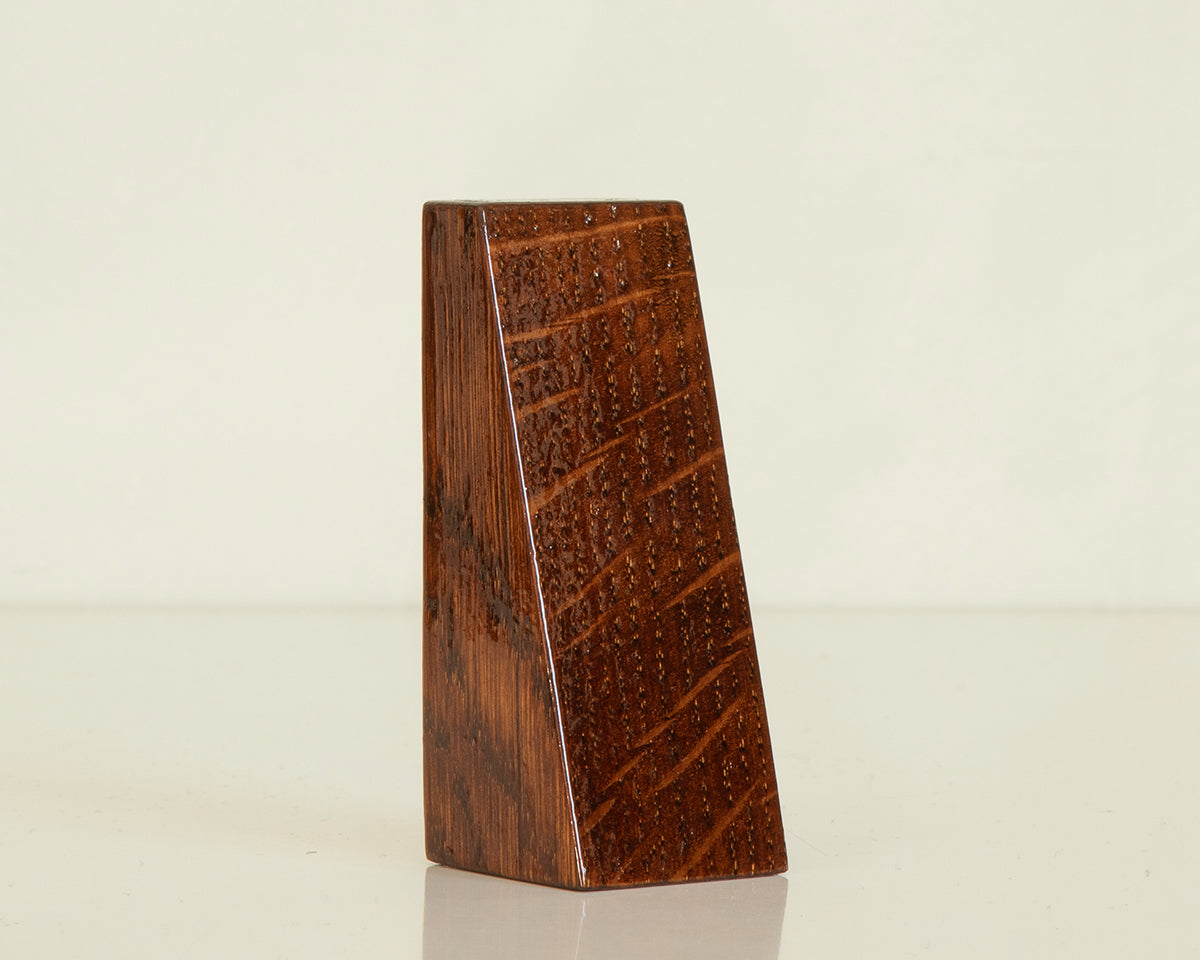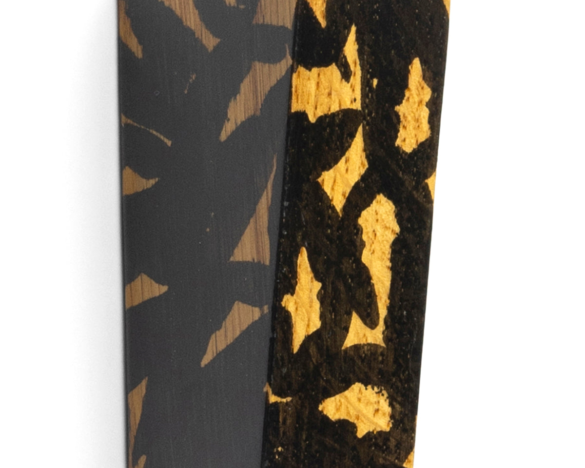 The asymmetrically protruding profile of these solid-wood handles by French designer Jonathan Cohen is inspired by the shape of a nose. Each size is available in a range of patterns and finishes. Photographed here are green ash and dark stained oak, glossy. NOTE: The color swatch images show a mix of glossy and matte finishes, with oak and fine ink shown in matte and dark stained oak, green ash, thick ink, and green ink shown in glossy.