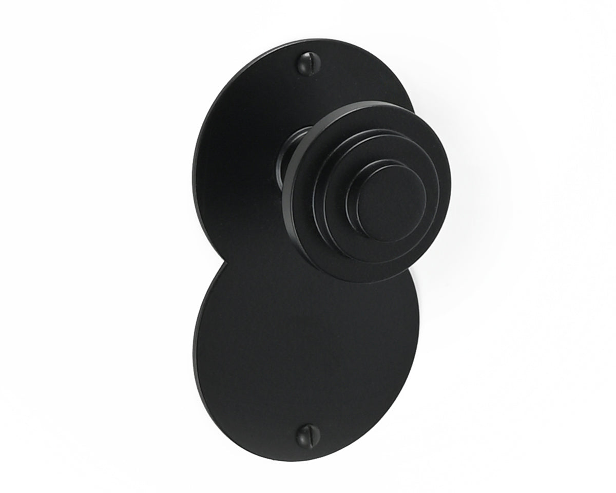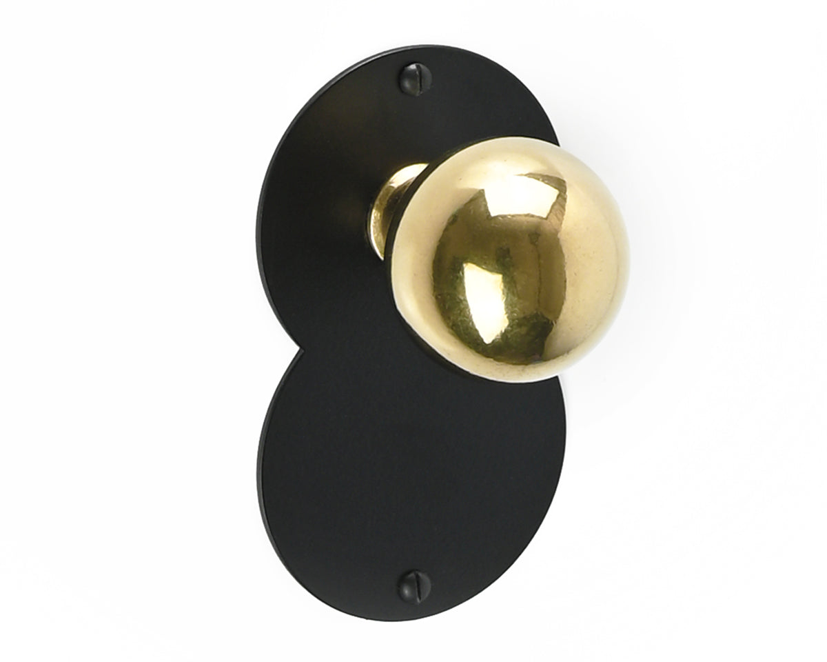 For the Point backplate, Bonnemazou Cambus imagined a simple round shape, repeated. We offer it with a choice of three knobs: The orb-shaped Bille Small (non-footed) and Bille Medium (footed), or the stepped Degre Medium. The plate and knob are each offered in either polished, waxed natural brass — which has an aged, shiny but not mirror-like appearance — or sandblasted stainless steel with a satin-black powder-coated finish, and screws to match. The natural brass finish is meant to look worn-in, and may arrive with small pits, scratches, or other imperfections, and will patina over time unless it’s polished back to its original state.