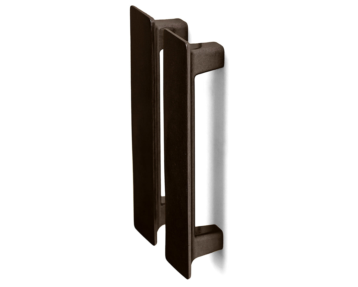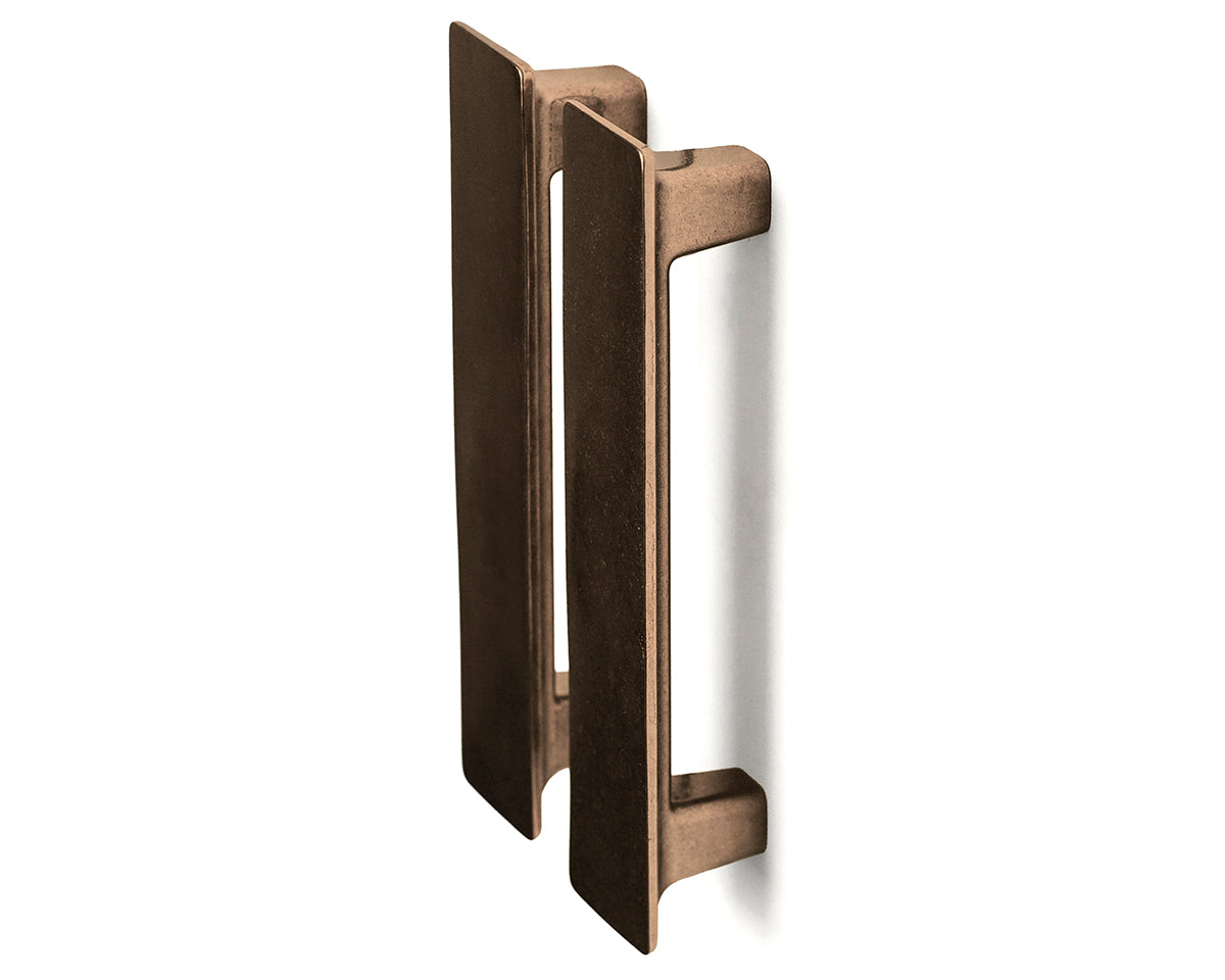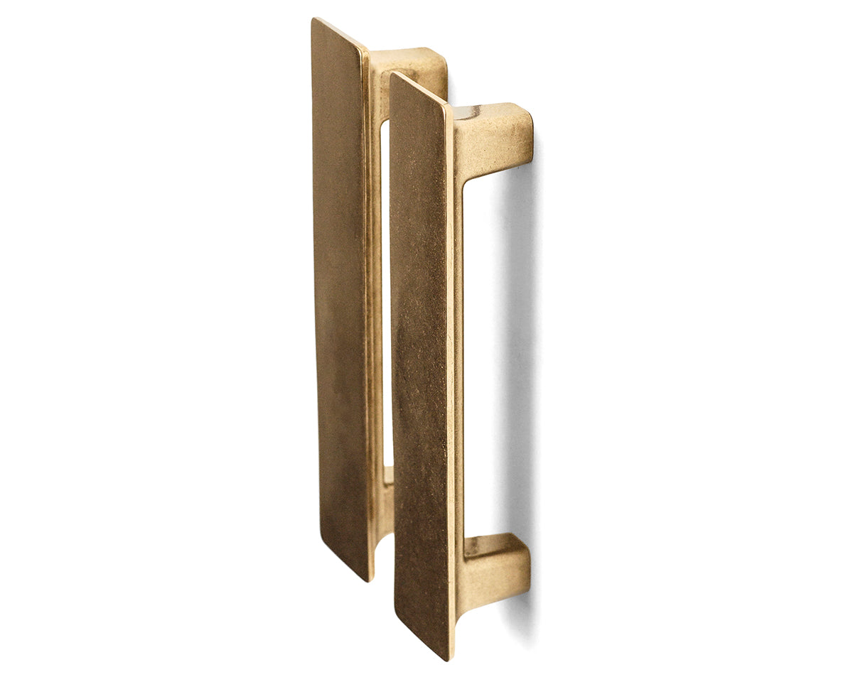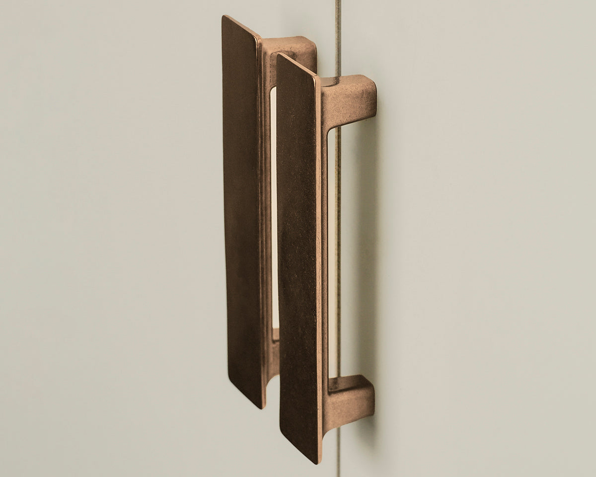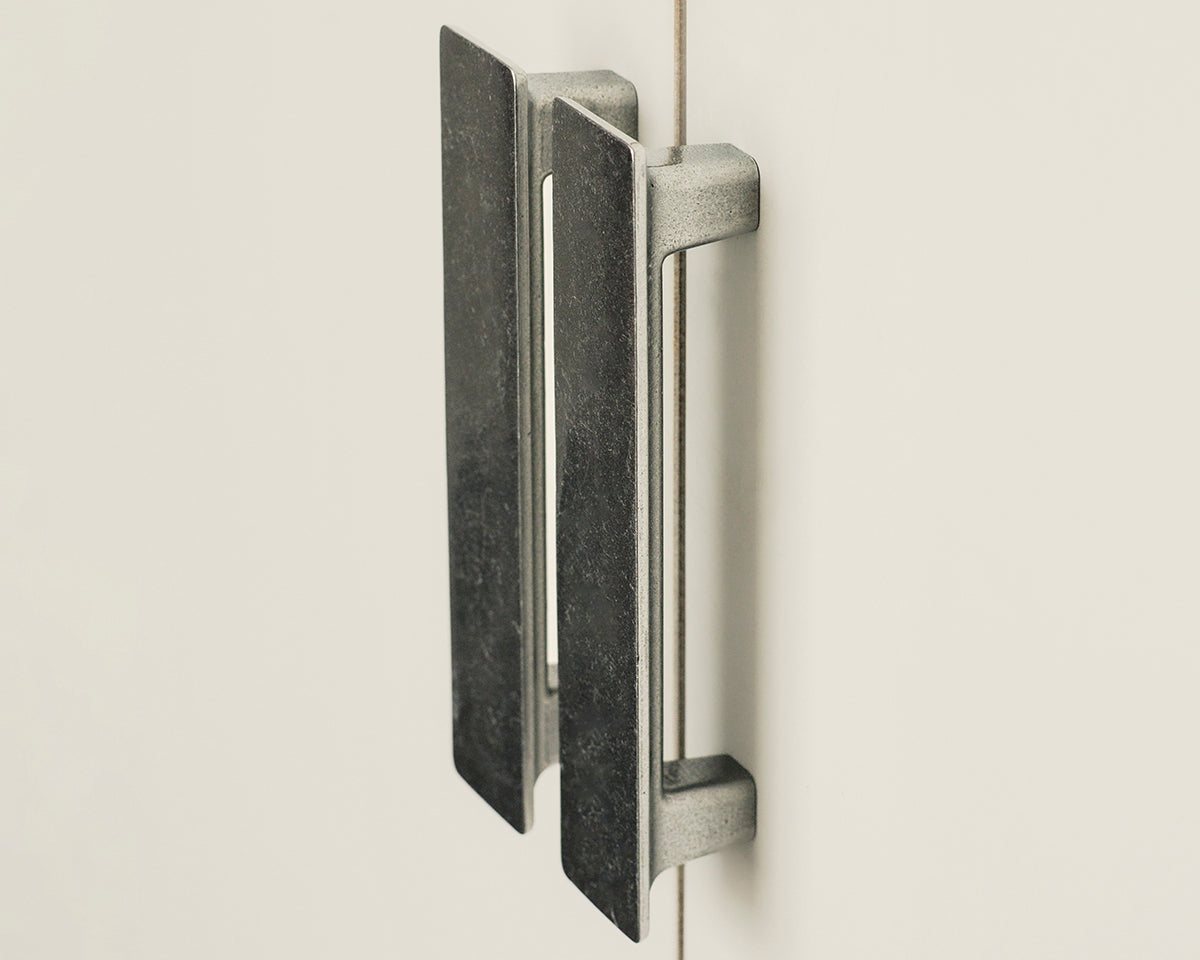 The Tab Appliance Handle by Australia's Studio Henry Wilson is designed to coordinate with a matching low-profile pull and knob for cabinets and drawers. The series draws reference from ski chalets of the 1960s and '70s, and the large flat surface makes for a generous contrast with any cupboard surface. Each handle is sand-cast and rumble-finished; because of small-batch manufacturing, slight variations will be visible from one piece to another. These production marks may include slight pour ripples or surface pitting. The non-blackened versions will oxidize and darken over time to reveal a distinctive patina. If preferred, use a metal polish such as Brasso to restore brightness. Delivered with adjustable screws.